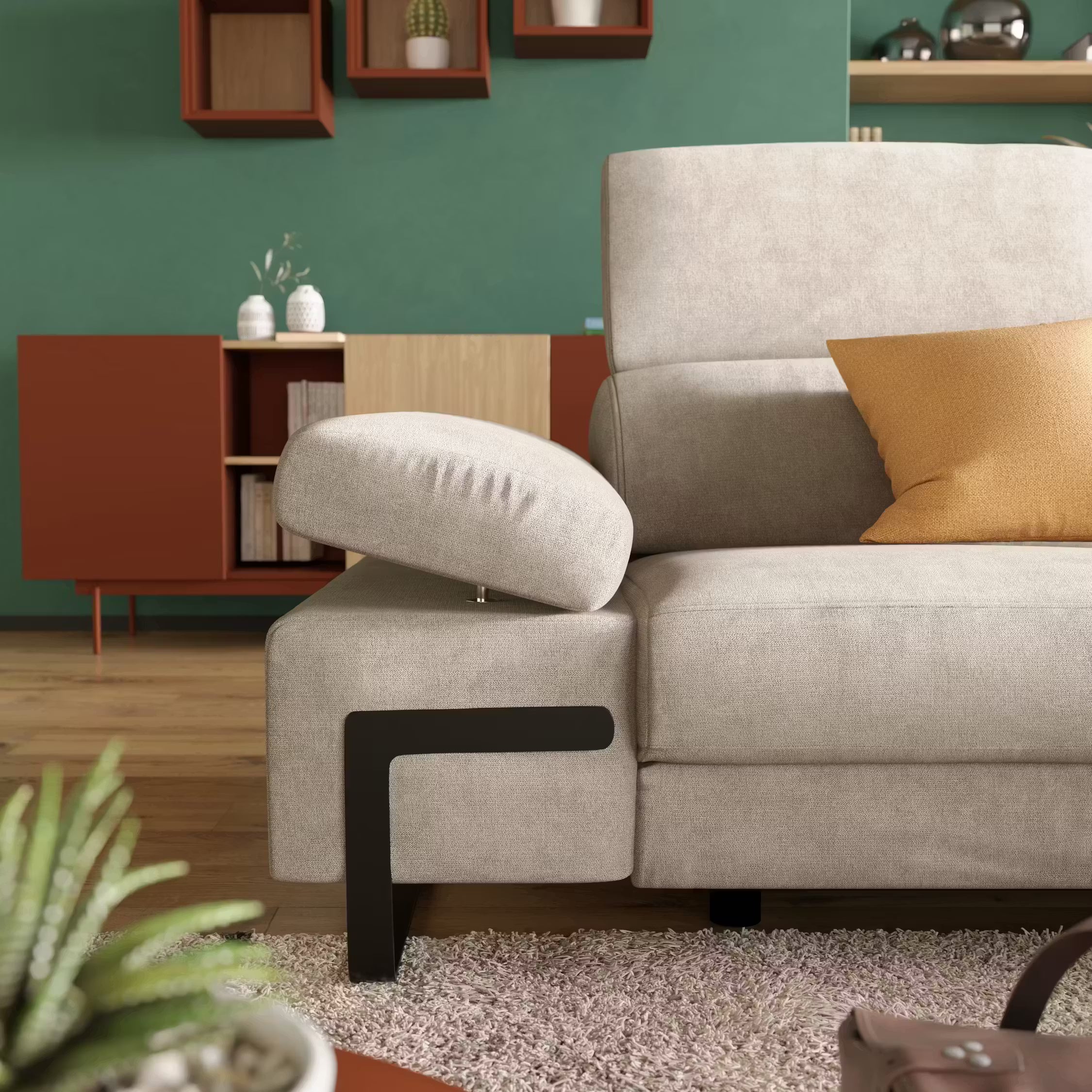 Il divano Donatello di Divani.Store è caratterizzato da 3 sedute allungabili, braccioli contenitori e poggiatesta reclinabili in tessuto antimacchia T23 beige. Il lato destro diventa una chaise lounge su gambe angolari bianche, su uno sfondo beige chiaro.Soggiorno moderno con il divano Donatello Divano angolare T23 beige di Divani.Store, cuscini arancione/beige, copriletto bianco, pianta alta vicino alla finestra, credenza in legno, mensole a muro con decori, lampada da terra e tappeto grigio chiaro su pavimento in legno.
