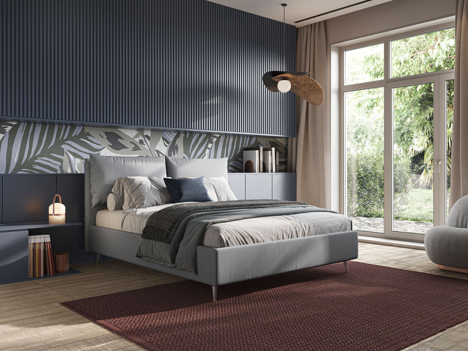 Modernes Bett mit Mahagonifüßen und wasserfestem geflammtem Stoff T03 blau
