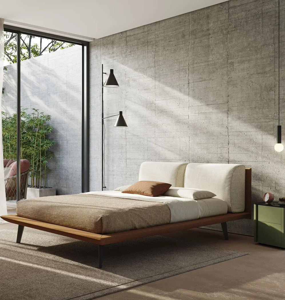 Zweifarbiges Designerbett mit Daunenkissen, Mahagonifüßen und wasserfestem Stoff leder