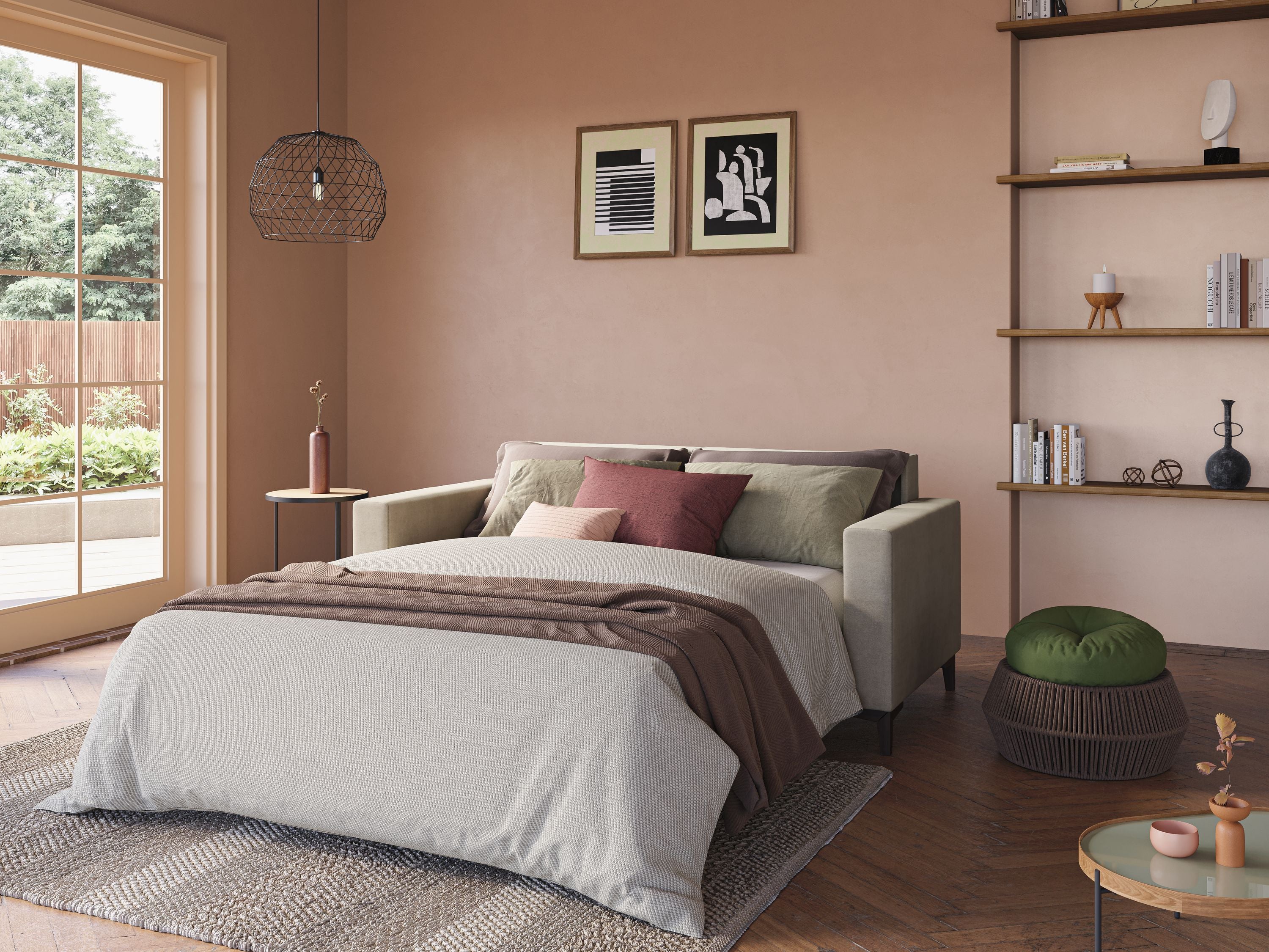Ecksofa mit Schlaffunktion mit Halbinsel aus weichem, wasserfestem Stoff T02 beige