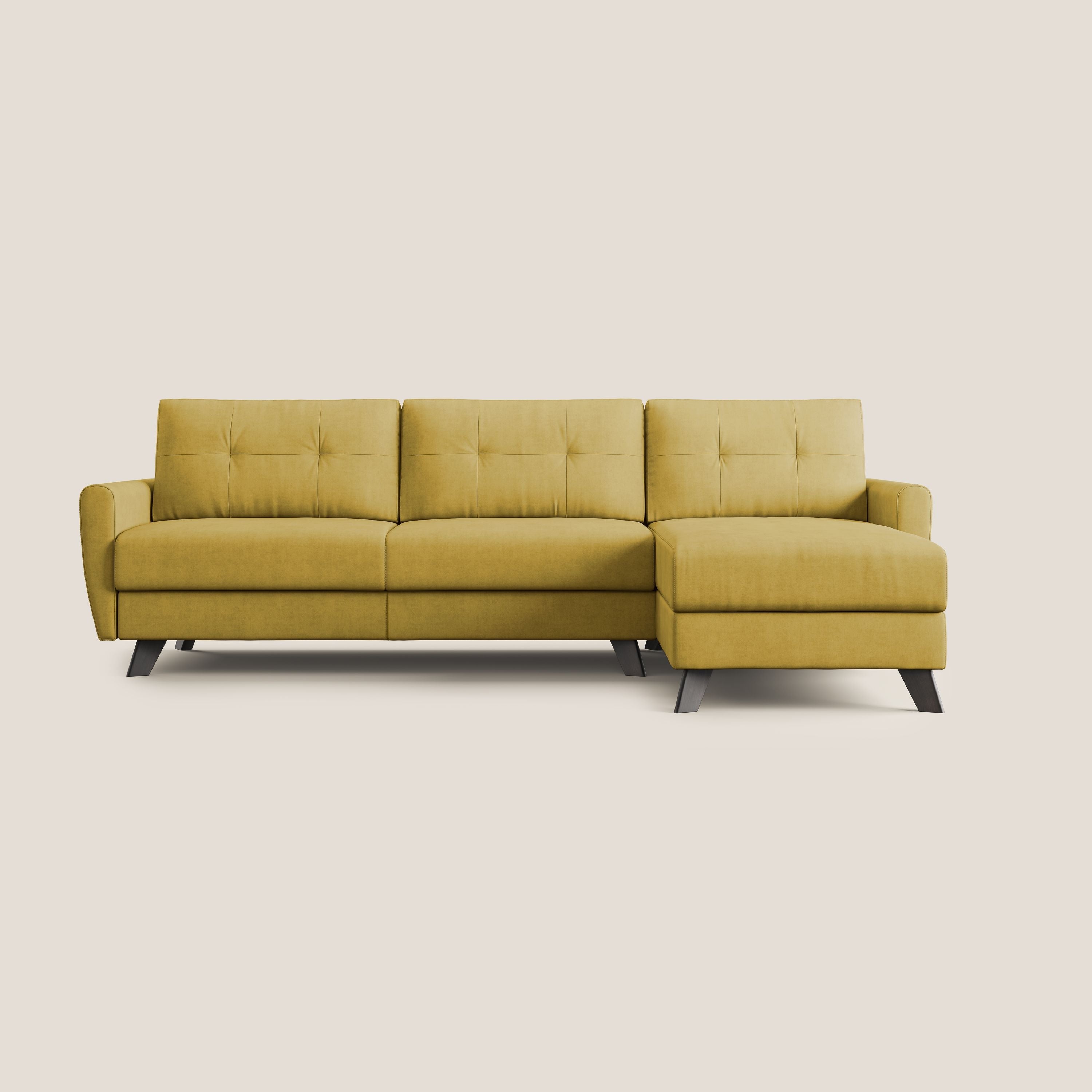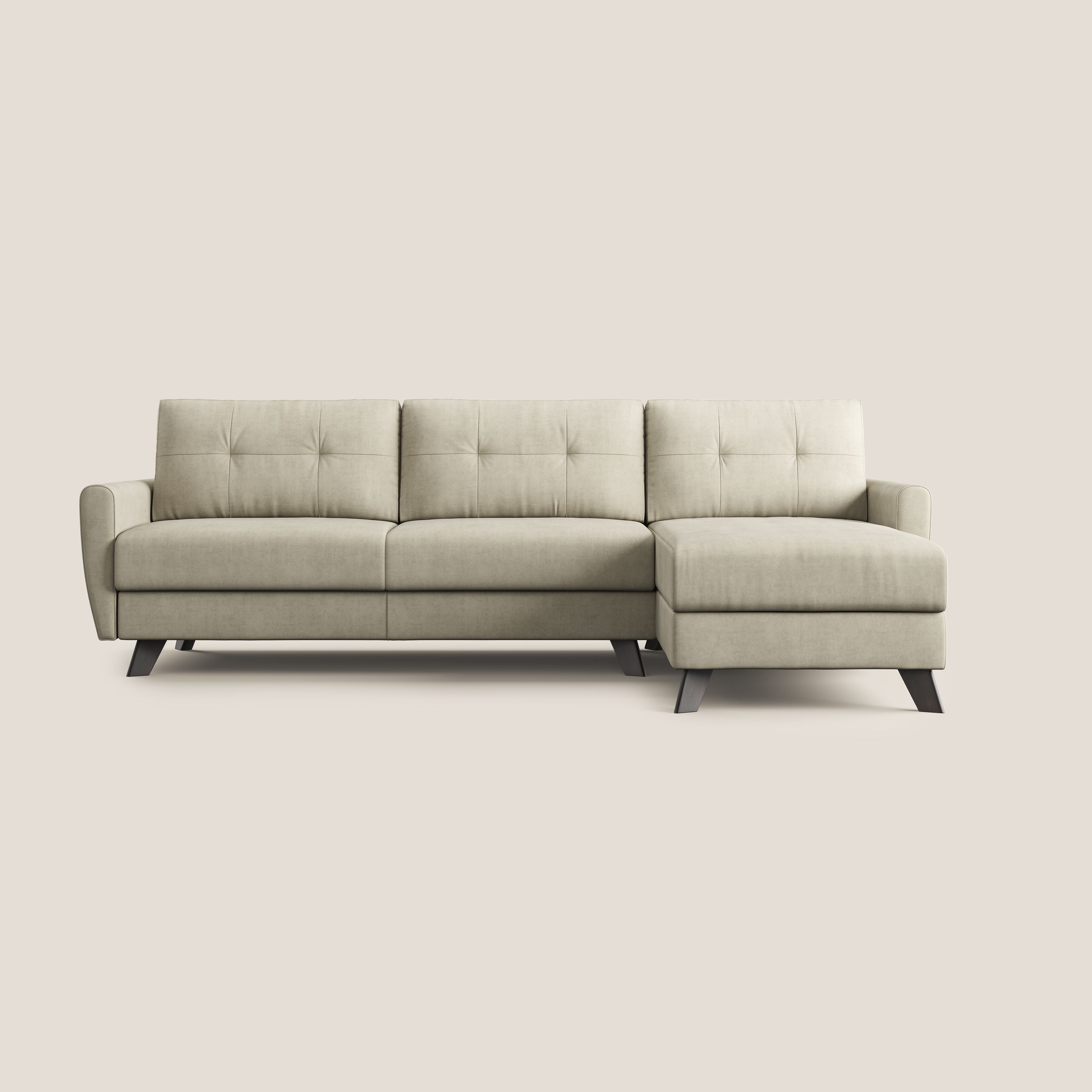 Das Schlafsofa Callisto mit seinen weichen und eleganten Linien ist eine moderne Interpretation des klassischen Capitonné-Sofas und verfügt über eine weich gepolsterte Rückenlehne, die zu 100% Made in Italy ist. Die Eckversion verfügt über eine 14 cm dicke Matratze mit hoher Dichte in 3 verschiedenen Größen (120 cm, französisches Doppelbett 140 cm und Standard-Doppelbett 160 cm) sowie über eine Halbinsel mit Ablagefach für die Unterbringung von Alltagsgegenständen, Decken und Bettwäsche.