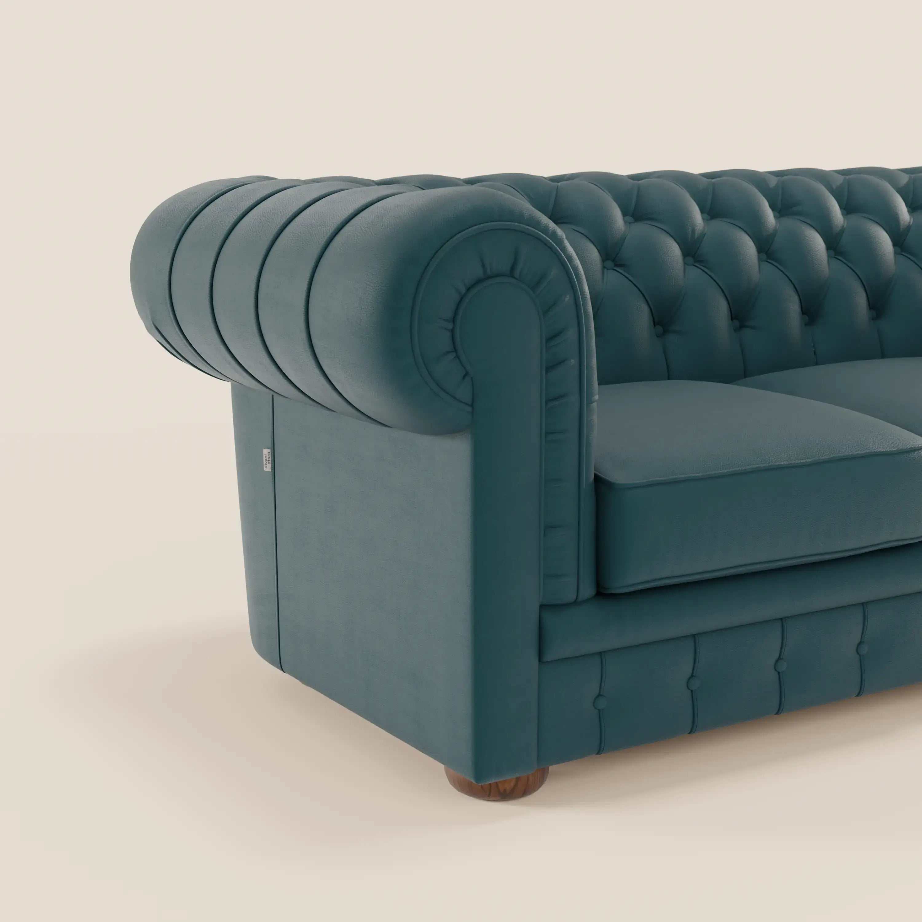 A differenza di molte produzioni che “simulano” l’effetto capitonné su poliuretano stampato, Chester nasce da una lavorazione interamente artigianale: ogni piega, bottone e tiraggio del capitonné fatto a mano racconta una cura 100% Made in Italy. I braccioli arrotolati, la trapuntatura profonda e la seduta generosa trasformano il living in un vero salotto di carattere: un mix perfetto tra fascino “club” e presenza luxury contemporanea.