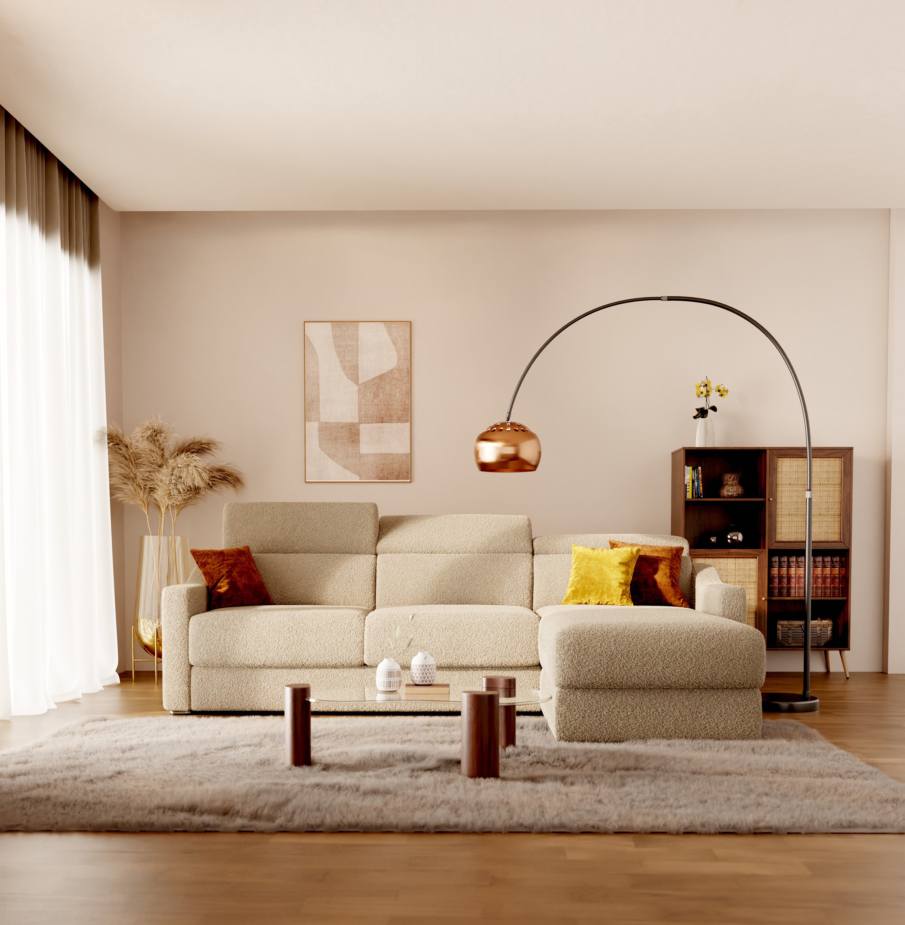 Wer einen raffinierteren Look wünscht, kann sich für ein modulares Sofa mit Bouclé-Effekt oder farbigem Samt entscheiden, das Texturen und einhüllende Farbtöne für ein gemütliches Ambiente kombiniert.
