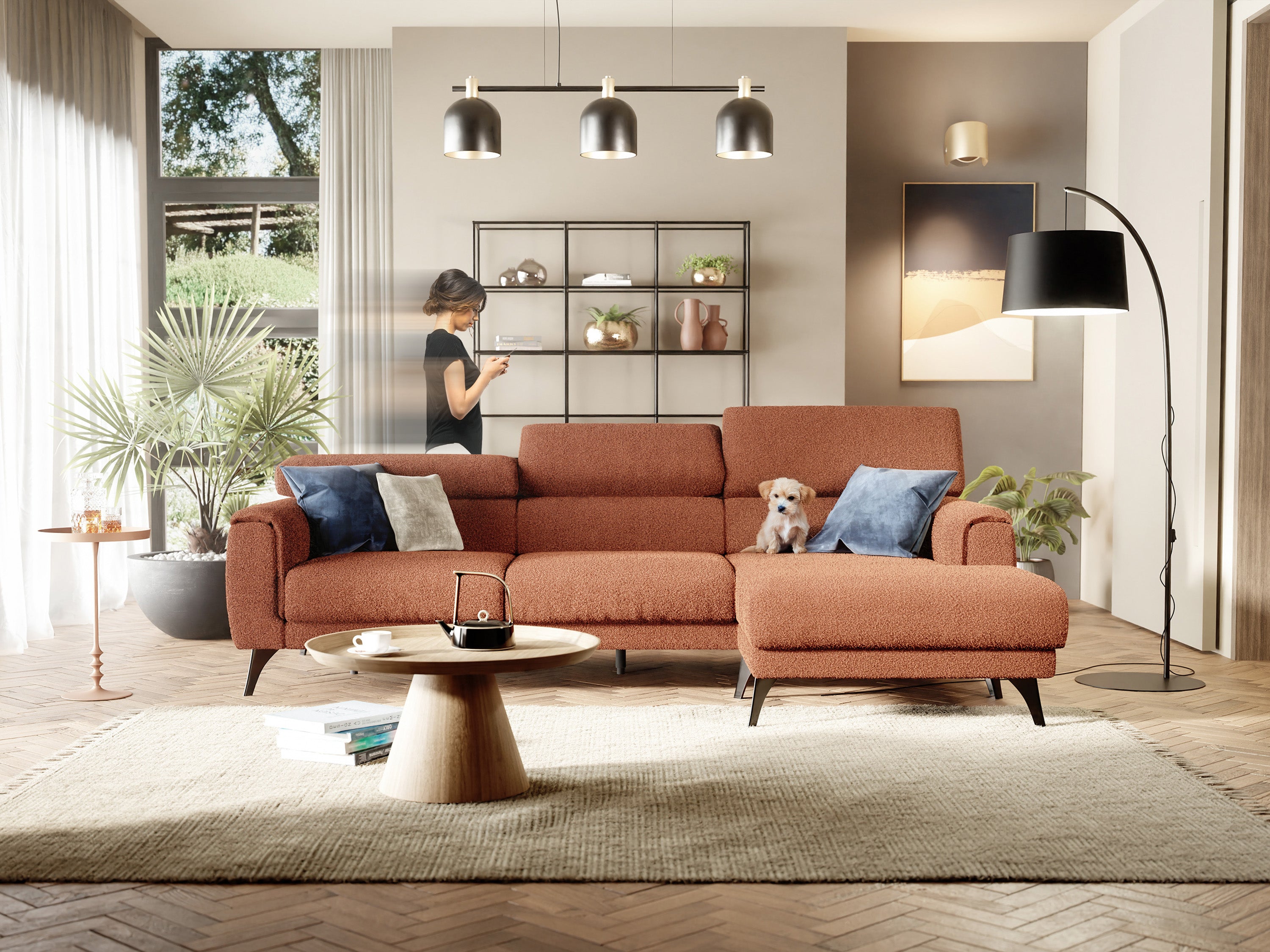 Für diejenigen, die eine gemütliche und warme Atmosphäre bevorzugen, passt ein braunes oder sienafarbenes Ecksofa hervorragend zu Holzmöbeln und natürlichen Materialien.