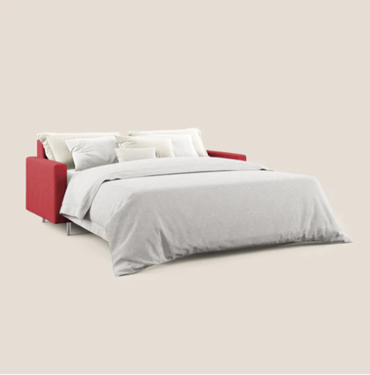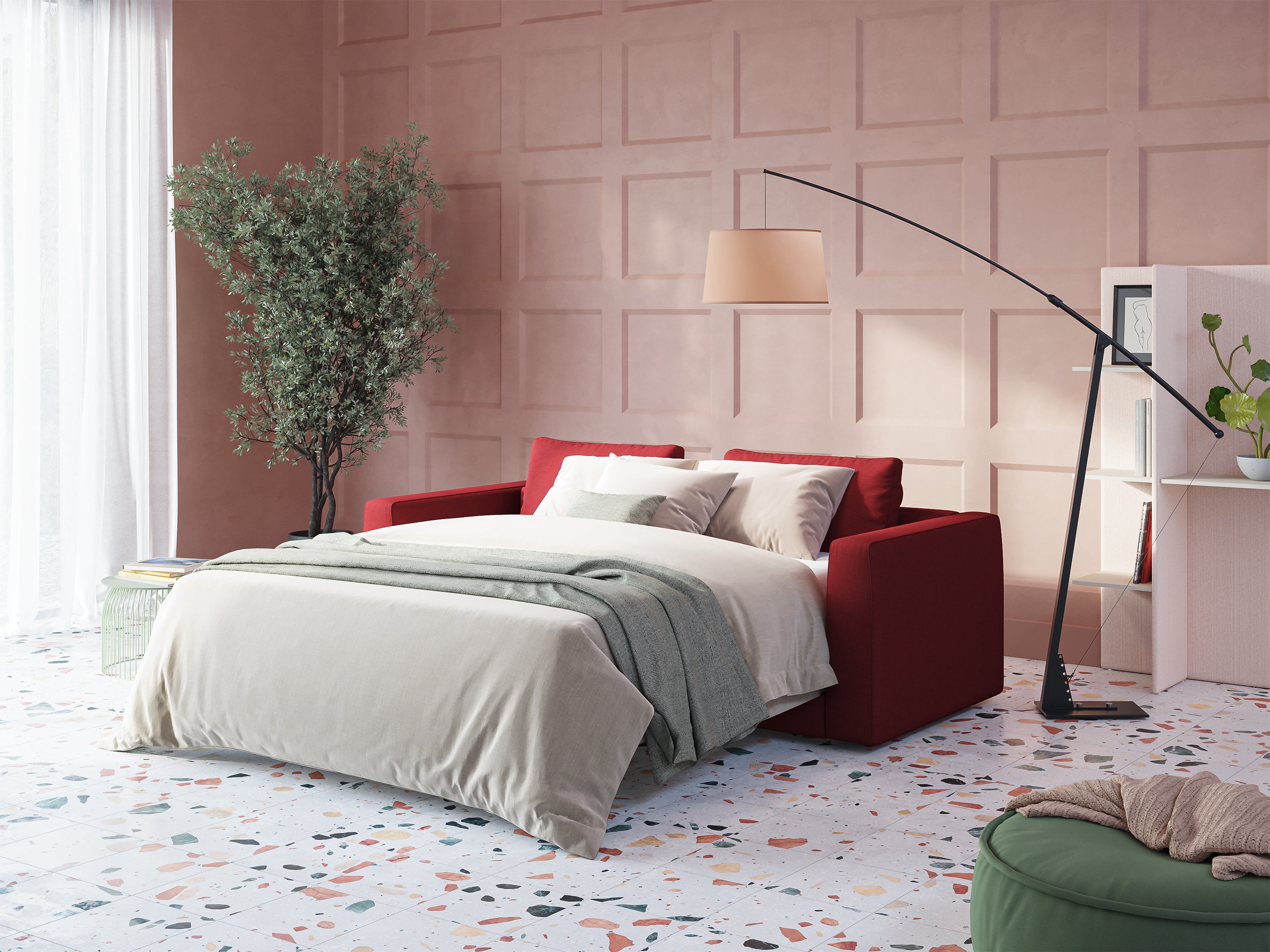 Ein farbiges Schlafsofa muss nicht nur ästhetisch ansprechend, sondern auch praktisch sein: Am besten ist es, abnehmbare oder schmutzabweisende Bezüge zu wählen, vor allem, wenn es häufig benutzt werden soll.