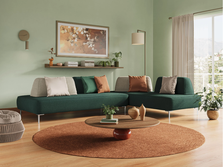 Ein salbeigrünes oder puderblaues Modulsofa verleiht dem Ganzen einen frischen und modernen Touch, perfekt für junge und zeitgenössische Umgebungen.