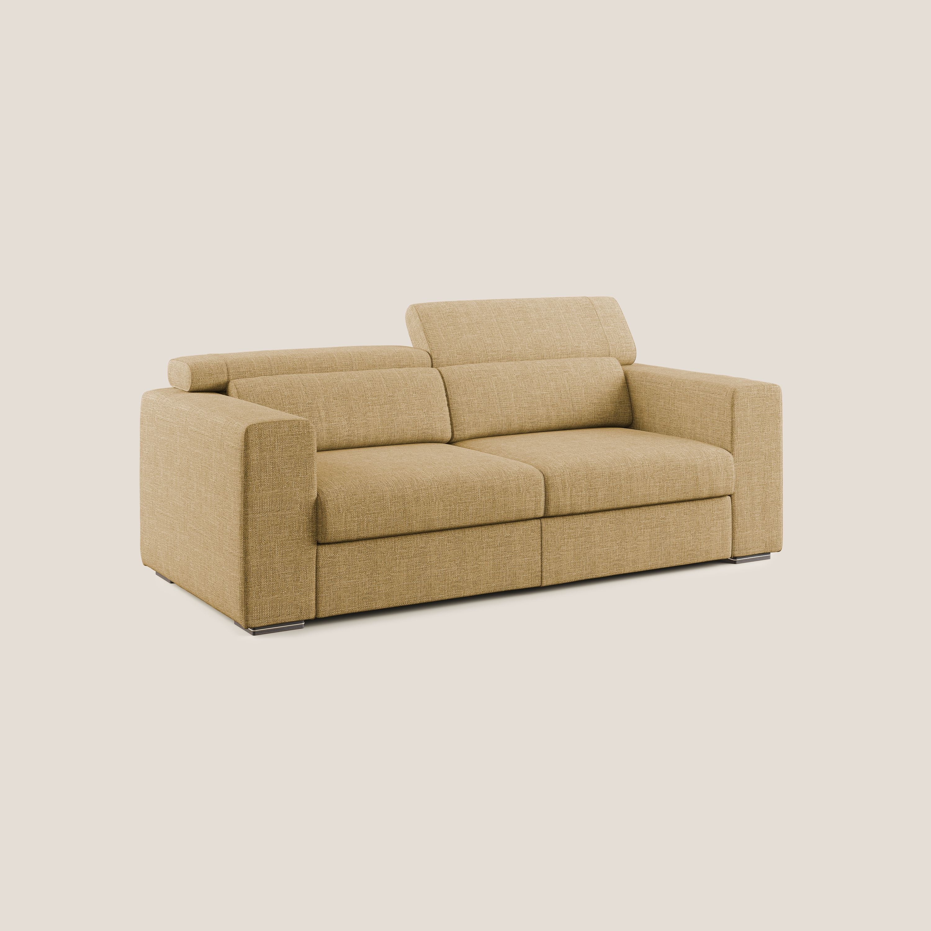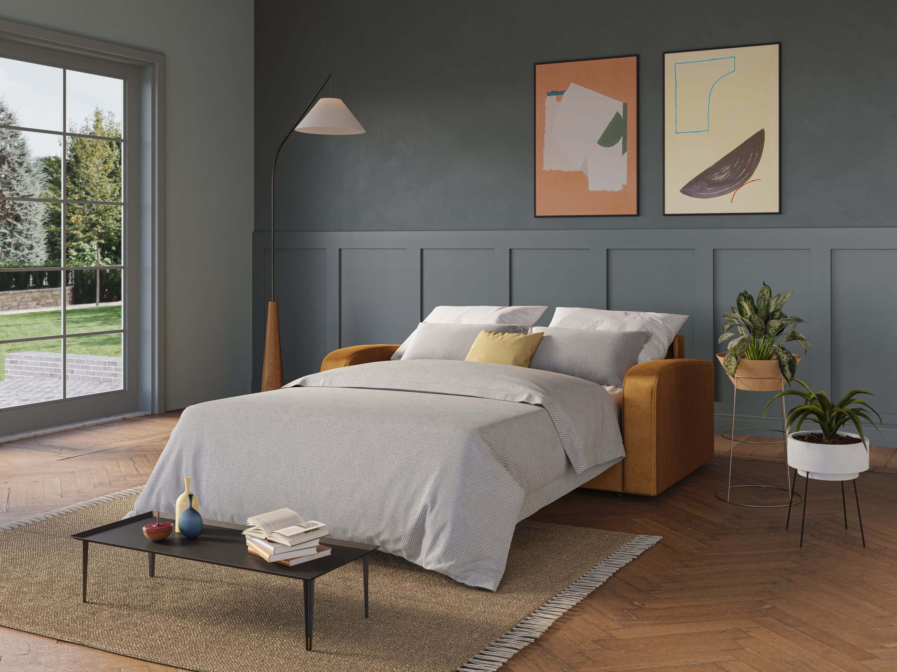 Ein senffarbenes oder orangefarbenes Schlafsofa ist ideal für moderne, lebendige Umgebungen und verleiht der Einrichtung Energie und Persönlichkeit.
