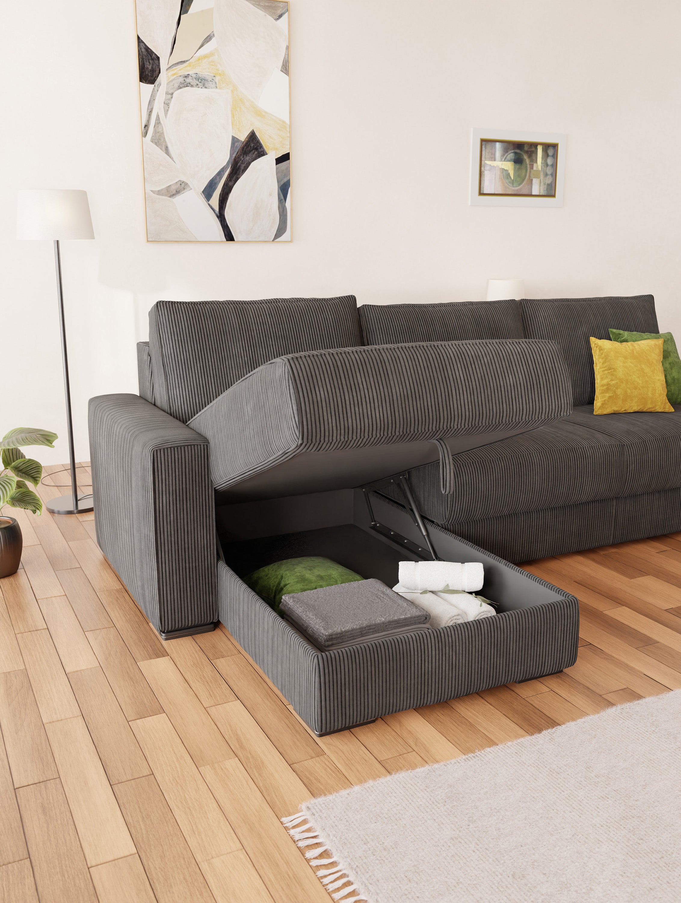 Wenn Sie einen raffinierten und modernen Look wünschen, kann ein schwarzes oder anthrazitfarbenes Ecksofa die perfekte Wahl sein, um dem Raum Tiefe und einen Hauch von Eleganz zu verleihen.