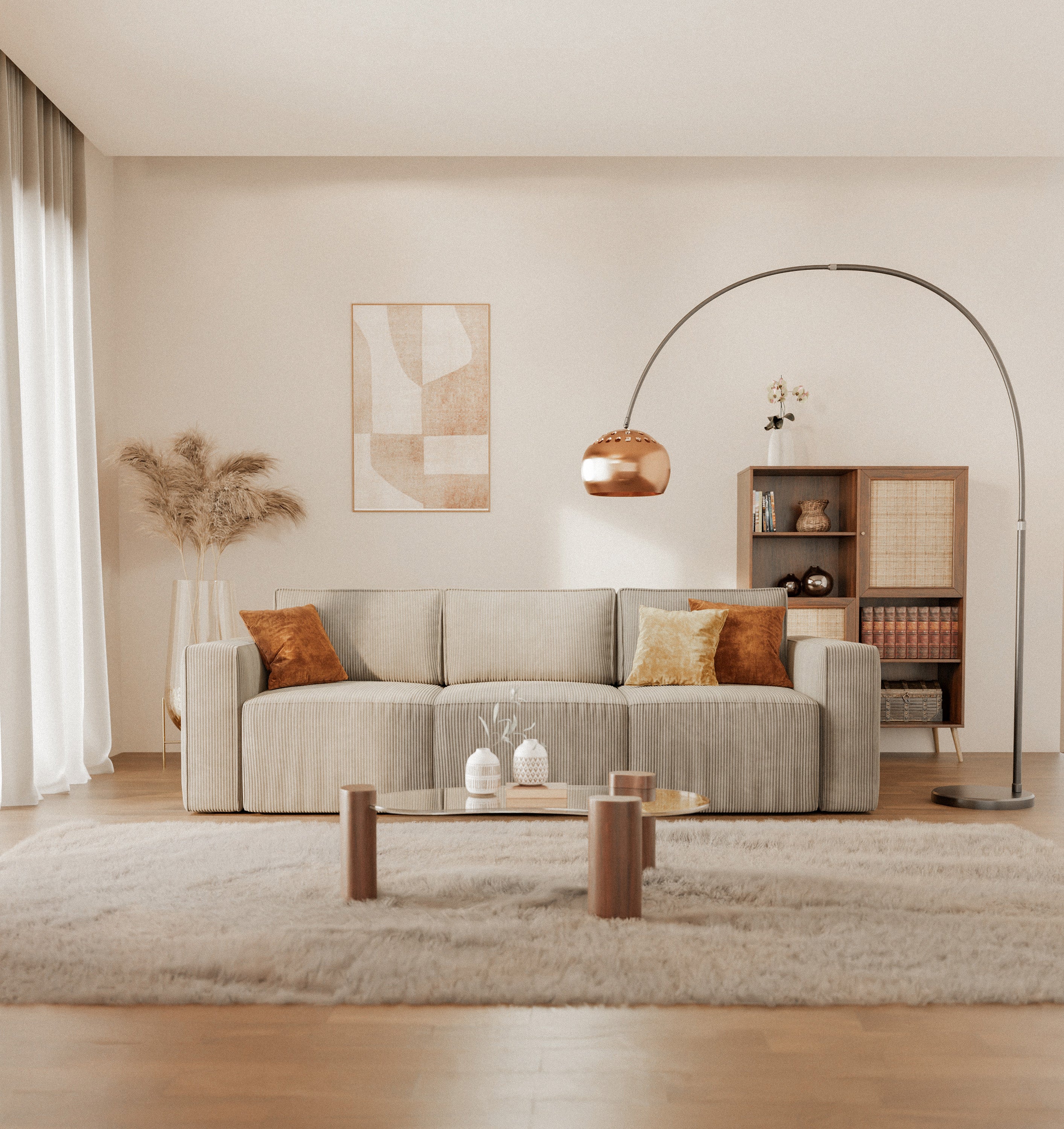 Ein hellgraues oder sandbeiges Modulsofa ist ideal für diejenigen, die eine neutrale und stets aktuelle Option wünschen, die sich an jede Entwicklung des Raums anpassen kann.