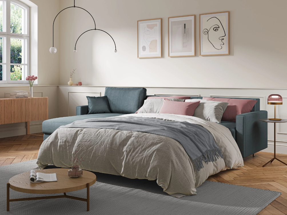 Wenn das Schlafsofa häufig benutzt wird, ist ein blaues oder dunkelbraunes Schlafsofa eine praktischere Lösung, die weniger anfällig für Schmutz und Abnutzung ist.
