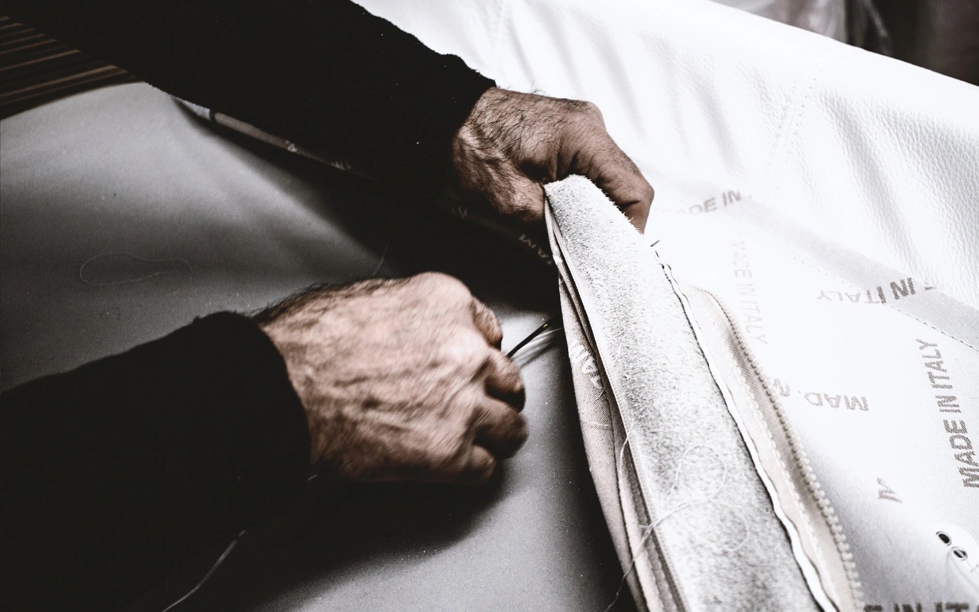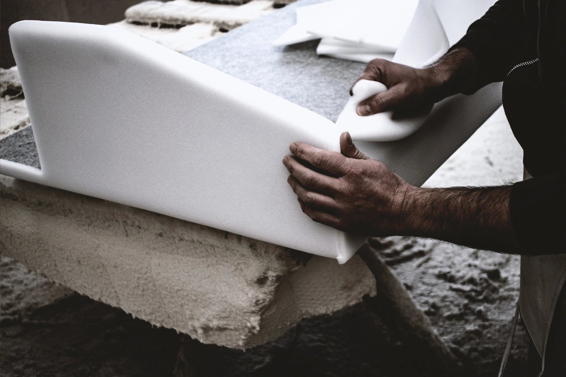 Die Karosserie ist fertig, die Polsterung auch. Unser Polsterer, eine Schlüsselfigur in der Produktion, kombiniert nun die Arbeit der anderen Abteilungen, um Ihr Sofa schließlich zum Leben zu erwecken. Handwerkskunst, die von Generation zu Generation weitergegeben wird.