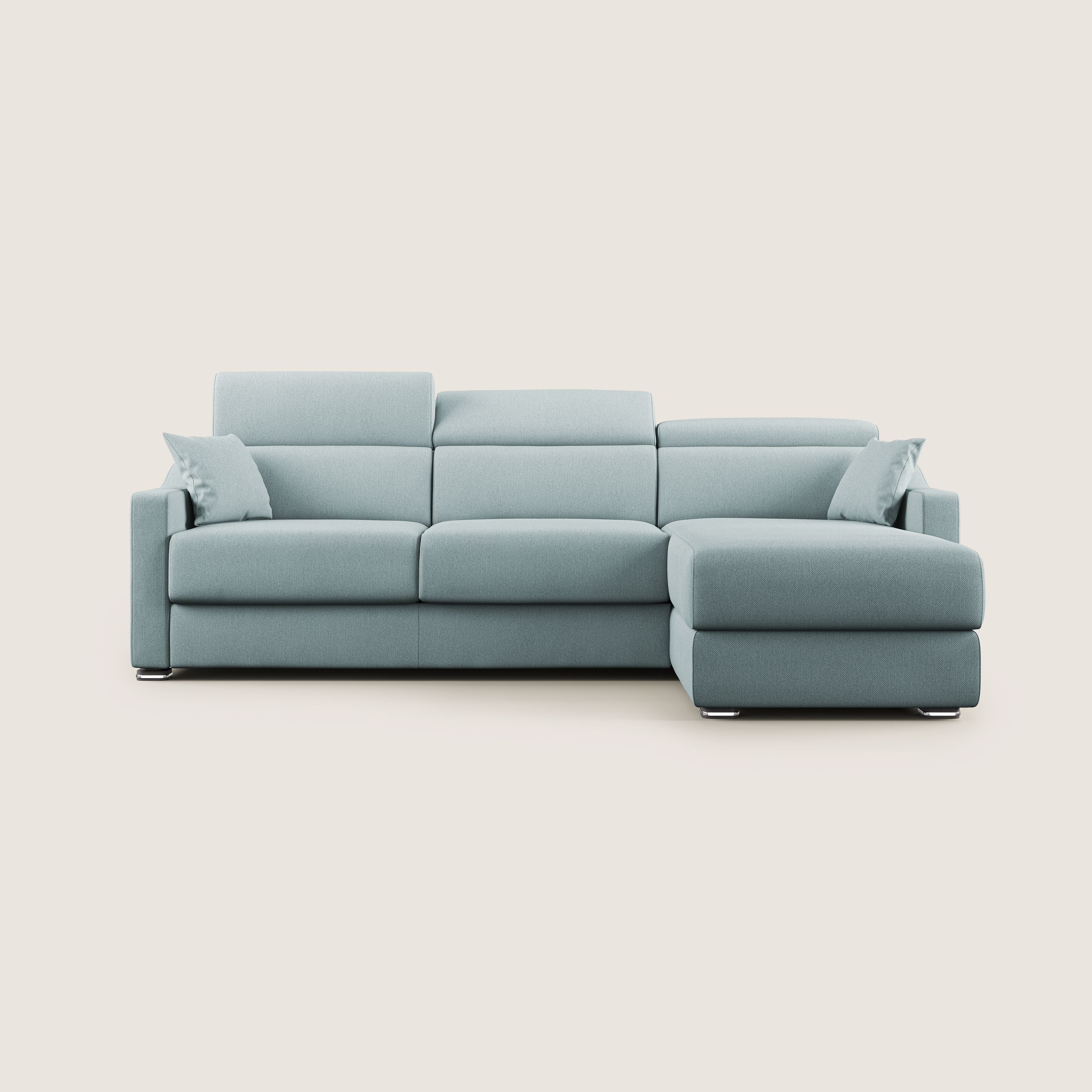 Eckversion des Schlafsofas Amber. Das Schlafsofa Amber mit seinen weichen Linien und seinem modernen Stil, der vom neuesten Design diktiert wird, verfügt über eine gepolsterte Rückenlehne und Kopfstützen mit 7 verschiedenen Neigungsstufen.