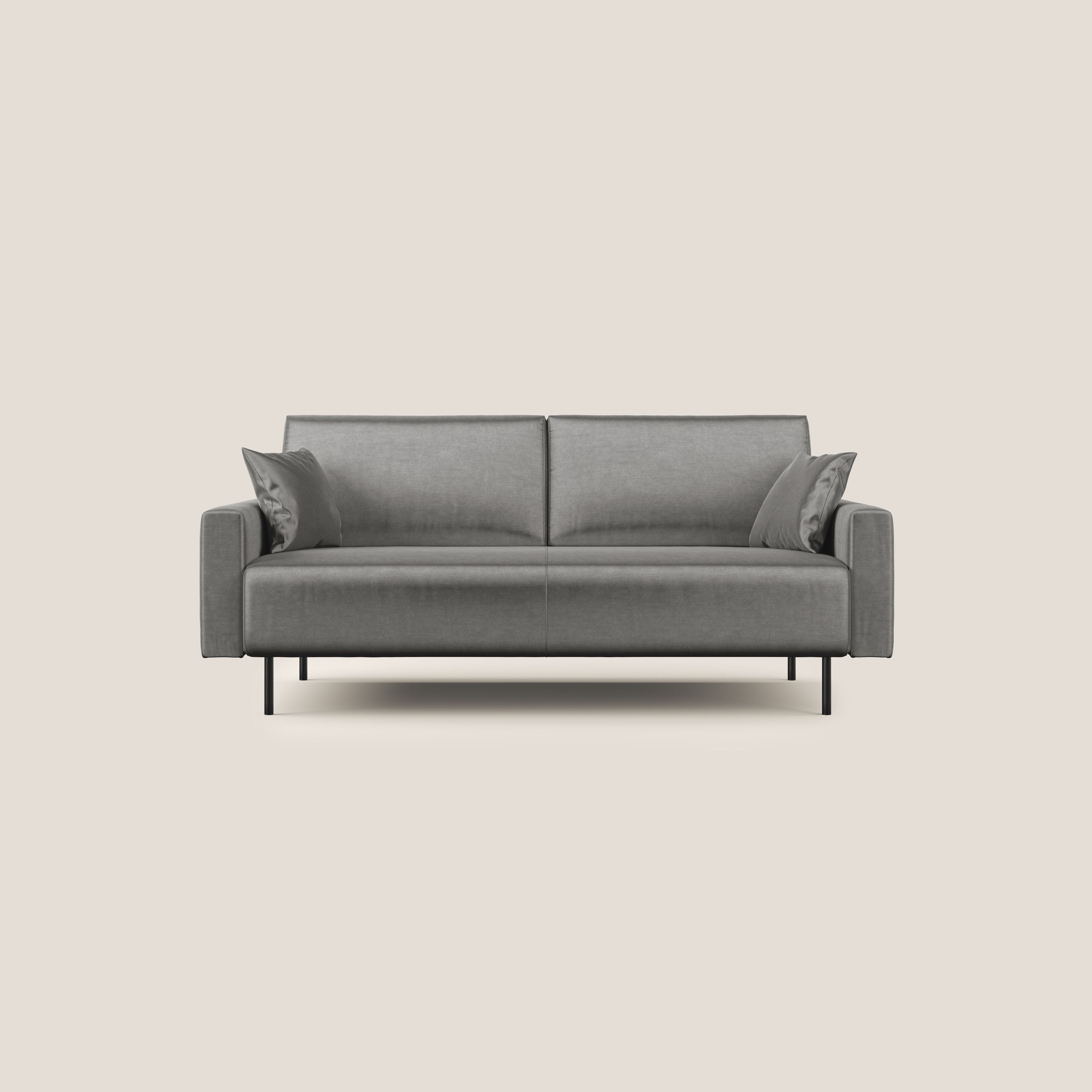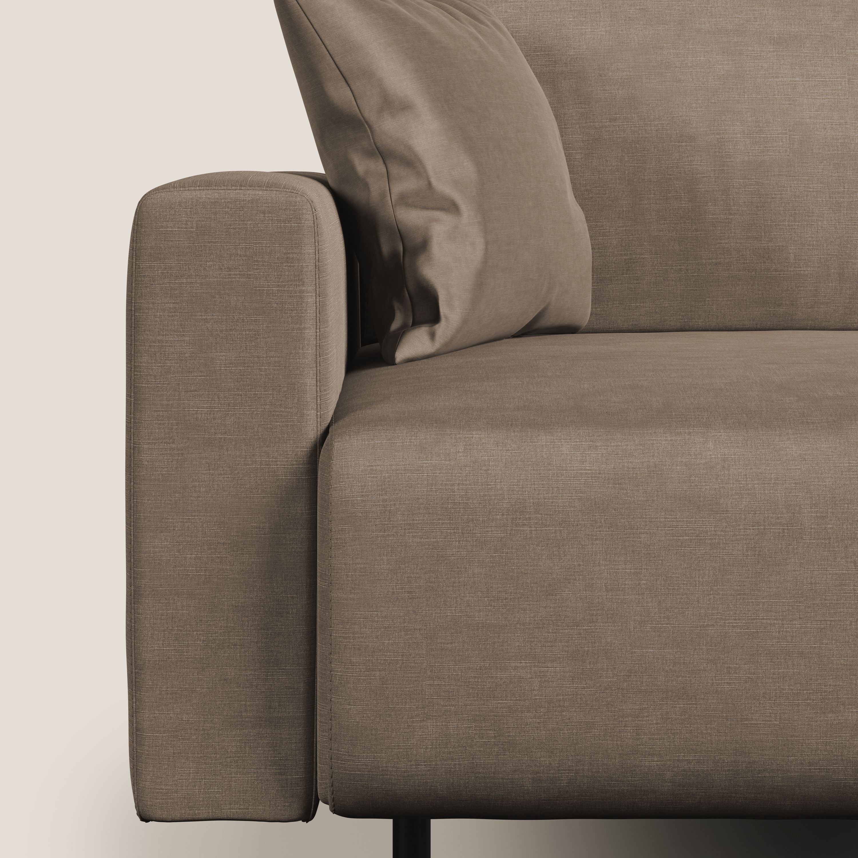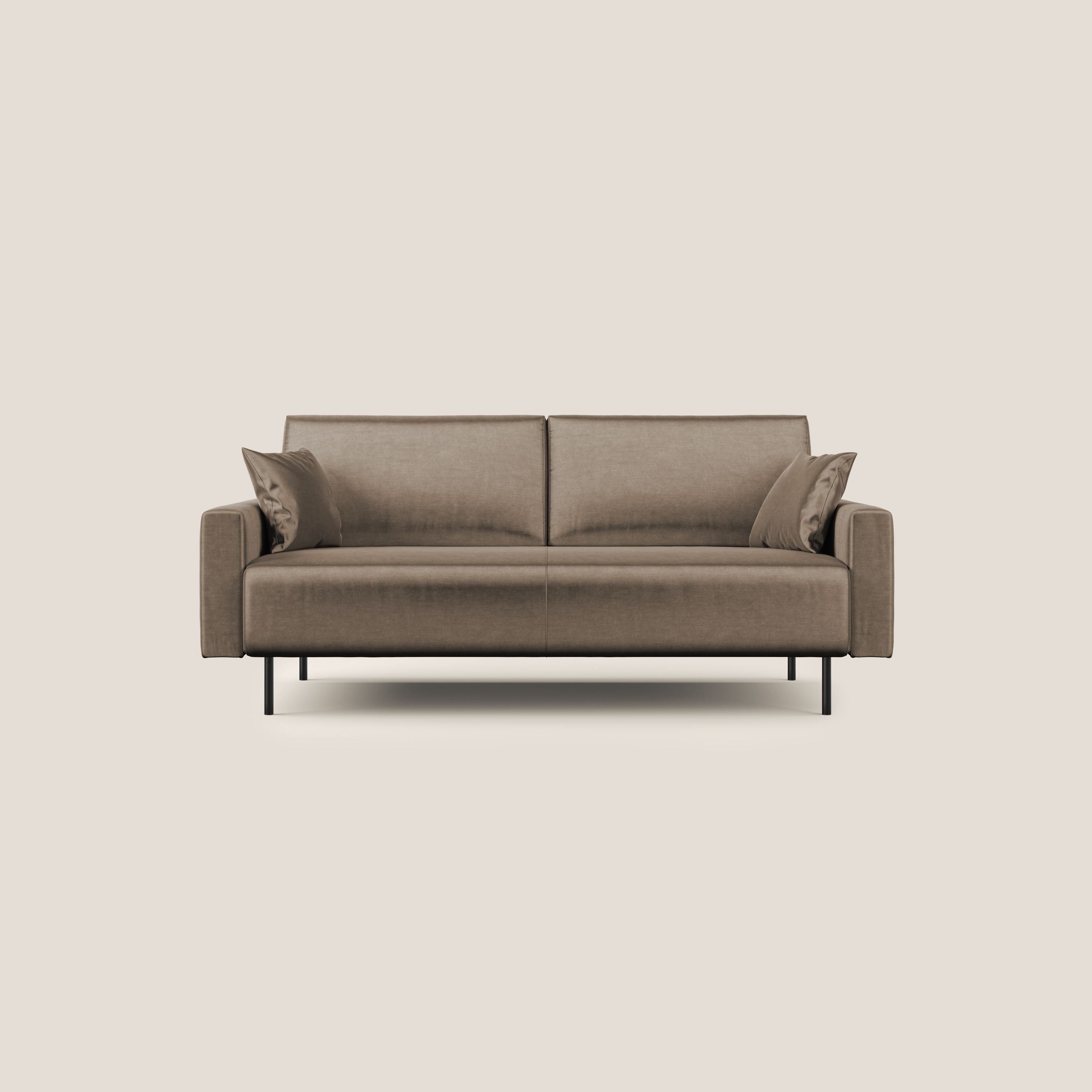 Die Sitzflächen sind aus zweischichtigem Gummi mit unterschiedlicher Dichte, d.h. eine weiche Schicht an der Oberfläche und eine härtere auf der Innenseite, um eine höhere Tragfähigkeit zu gewährleisten. Der wasserfeste Bezug aus nordischem Samt ermöglicht eine schnelle und einfache Pflege des Sofas: Es ist ein Kinderspiel, einen Fleck zu entfernen, bevor er sich vollgesogen hat. Darauf werden Sie nicht mehr verzichten können!