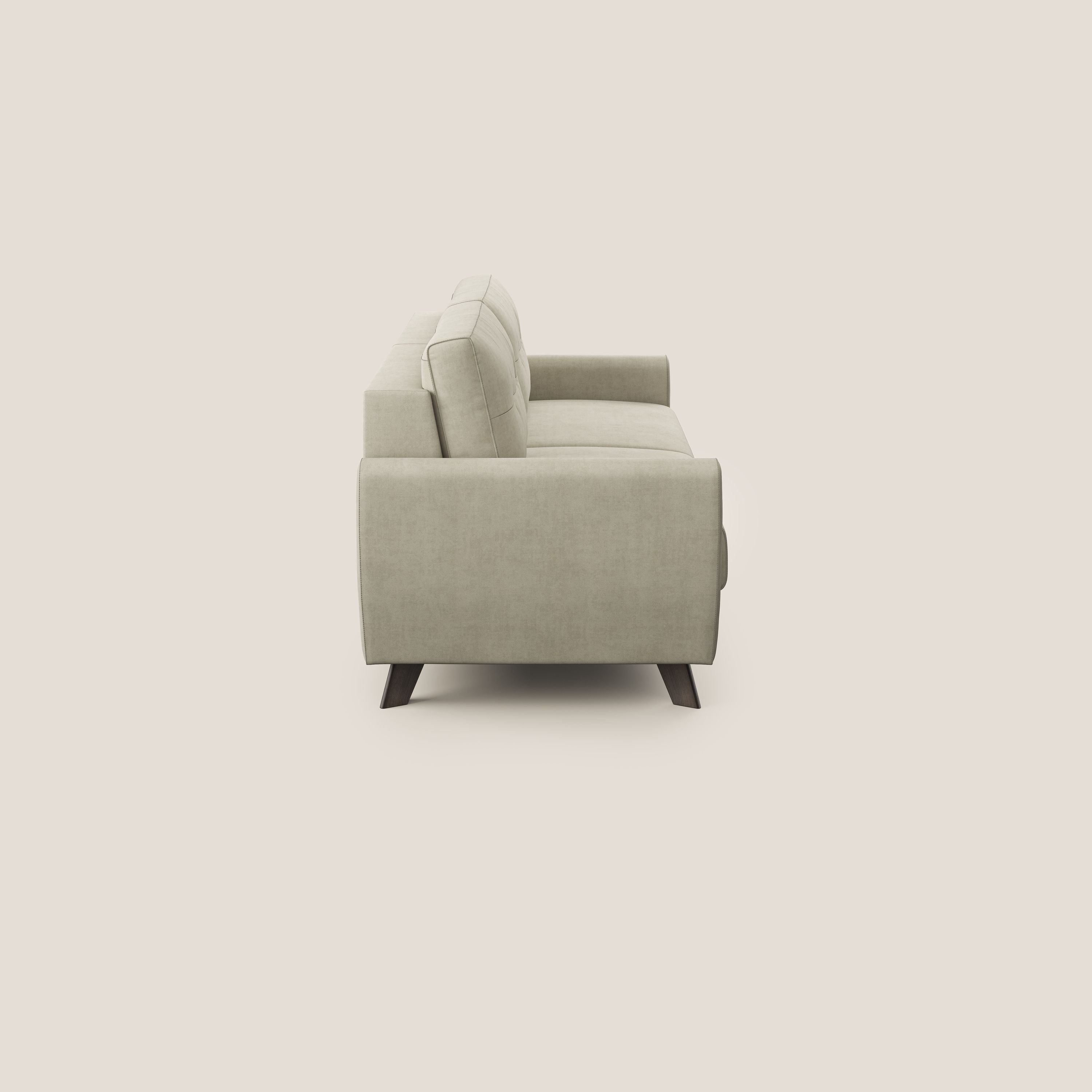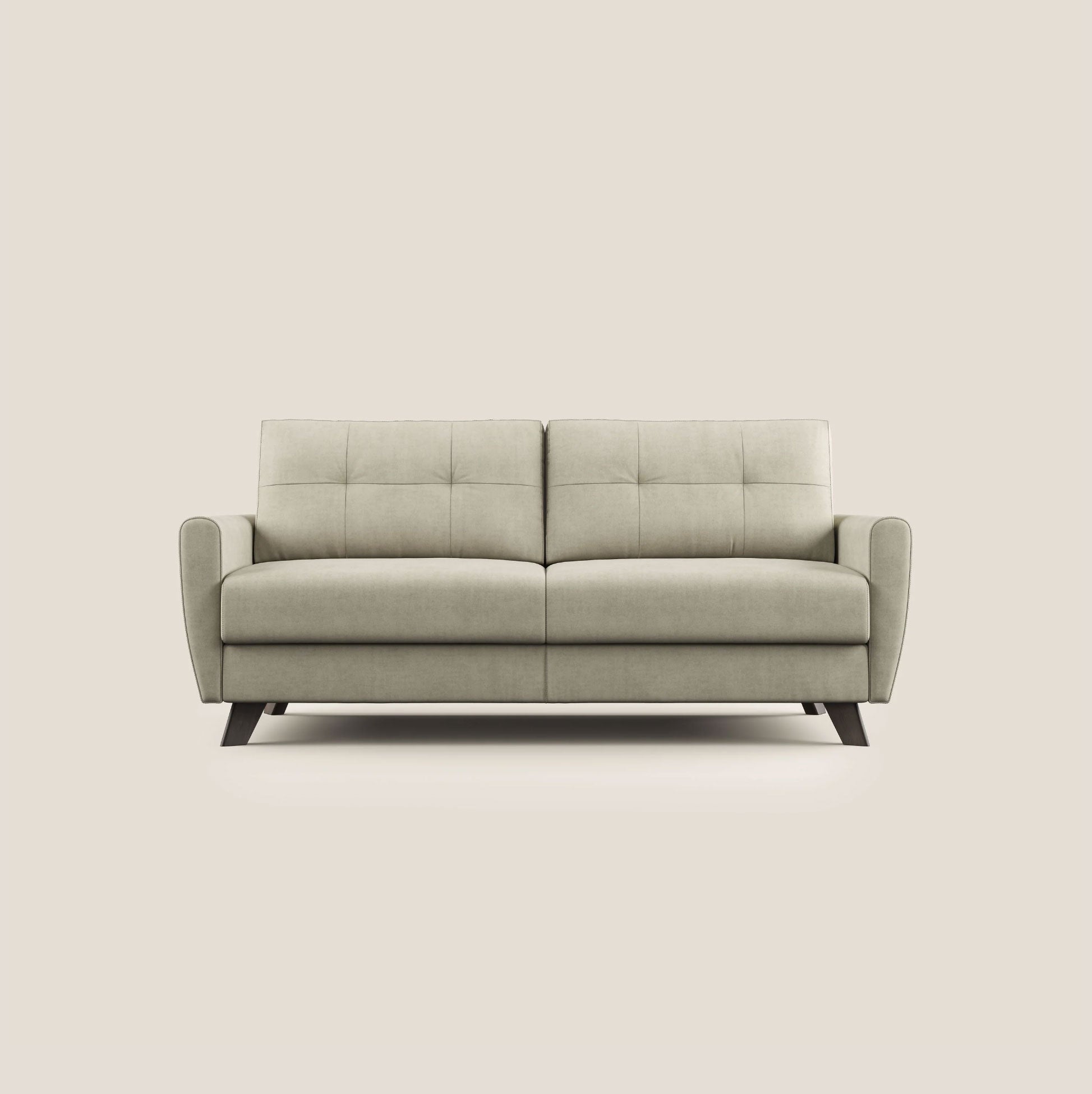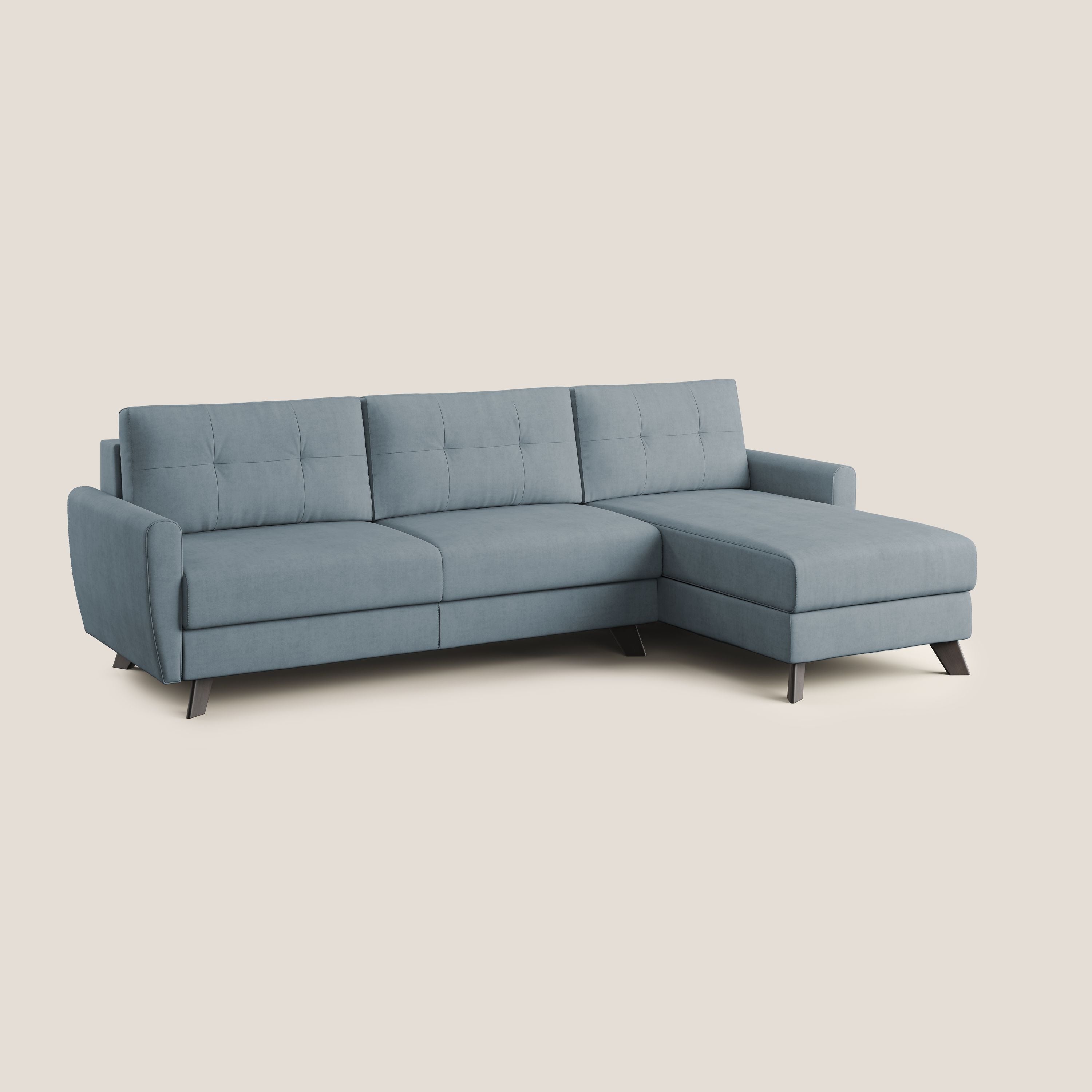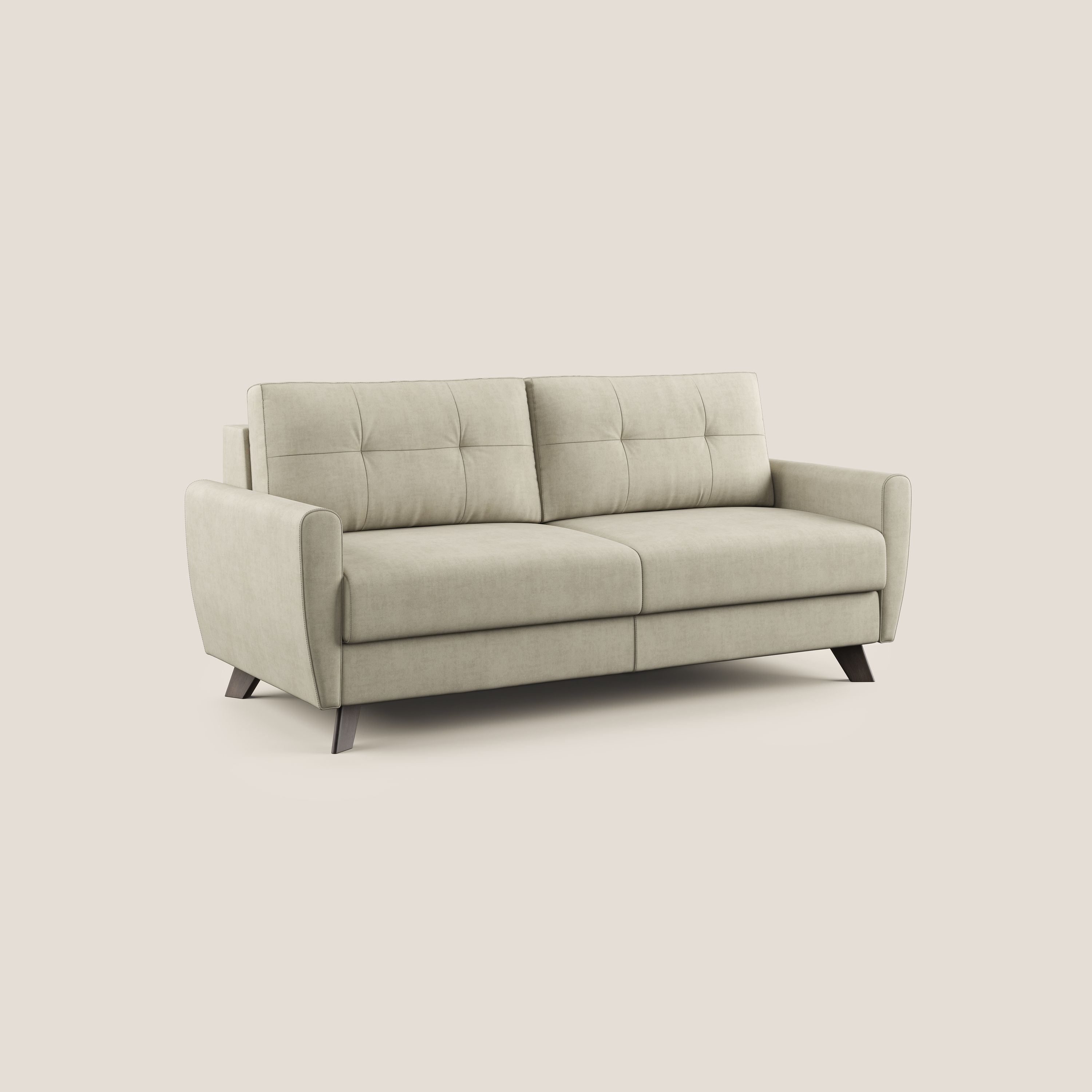 Seine Linien und Holzfüße passen perfekt zu einem skandinavischen und Shabby-Stil. Der Klappmechanismus hat eine elektrogeschweißte Netz-Schlafunterlage, kann aber auch mit der Schlafunterlage aus Buchenholz LATTENROST hergestellt werden. Beide haben am Ende elastische Bänder, die sich bei geschlossenem Sofa unter der Sitzfläche befinden und sie weicher und bequemer machen.