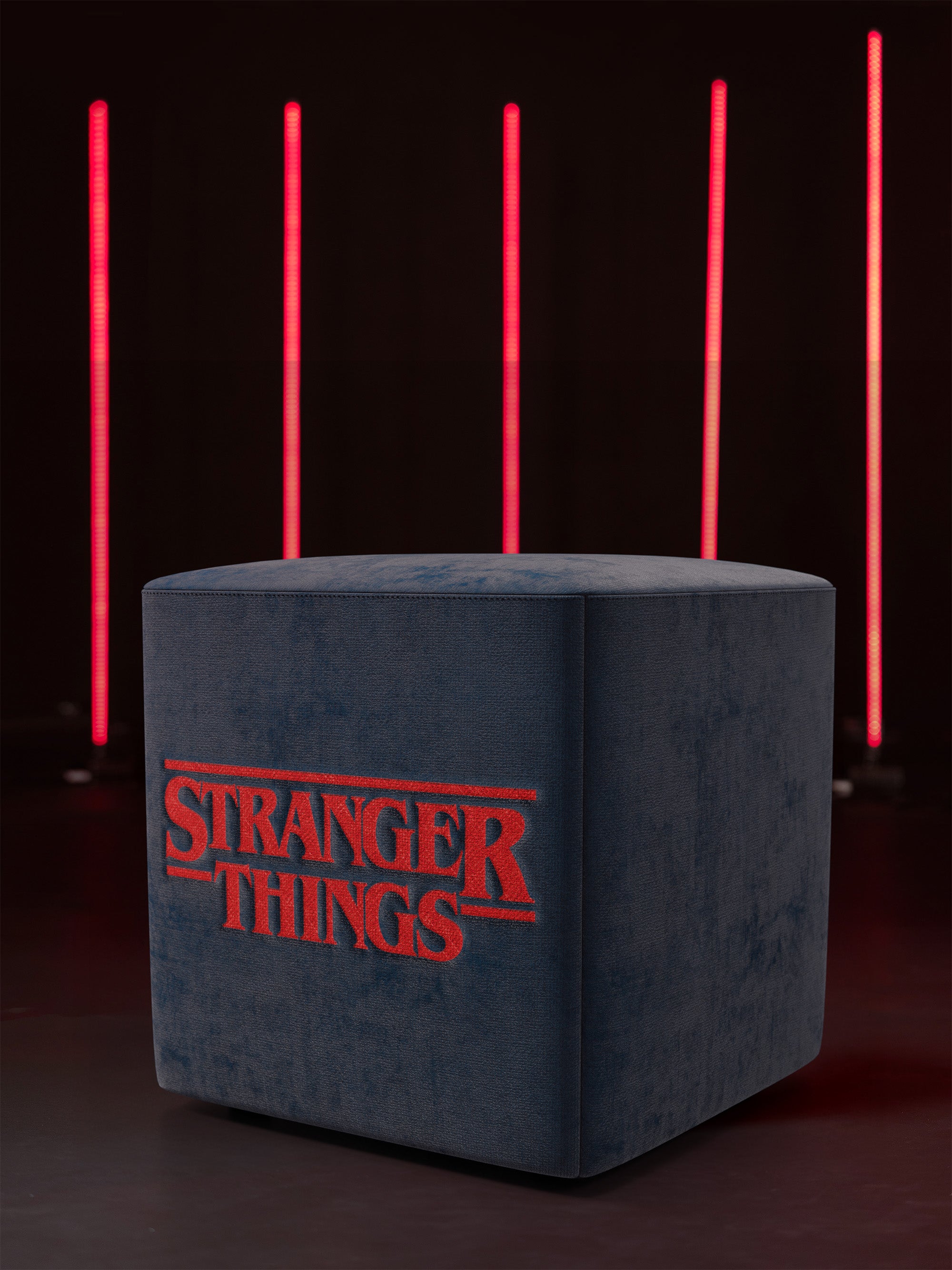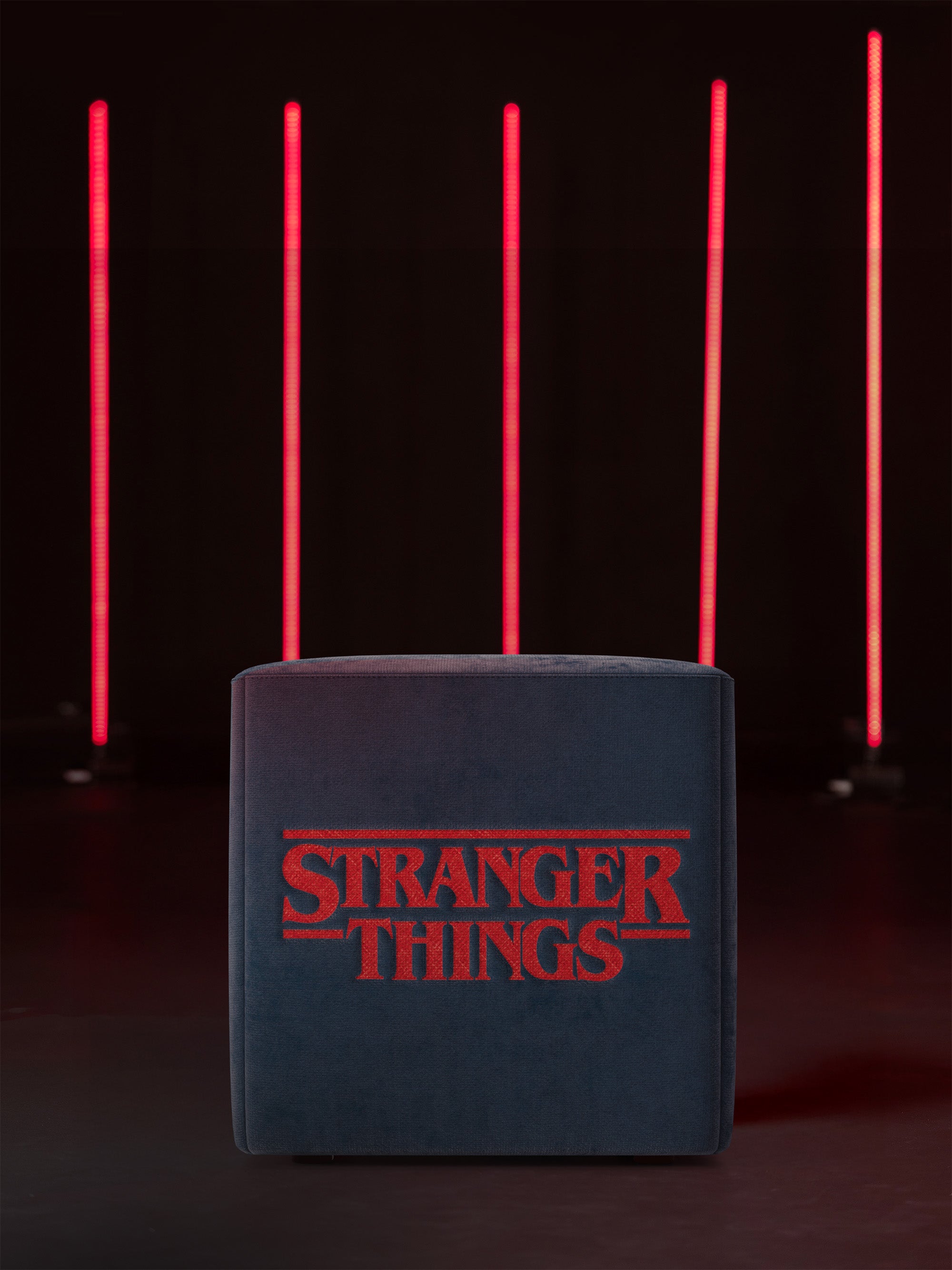 Kompakt, essenziell und voller Persönlichkeit: Der Hocker Cube – Stranger Things Edition ist das kultigste Accessoire der offiziellen Kollektion, die in Zusammenarbeit zwischen Netflix und Divani.store entstanden ist.