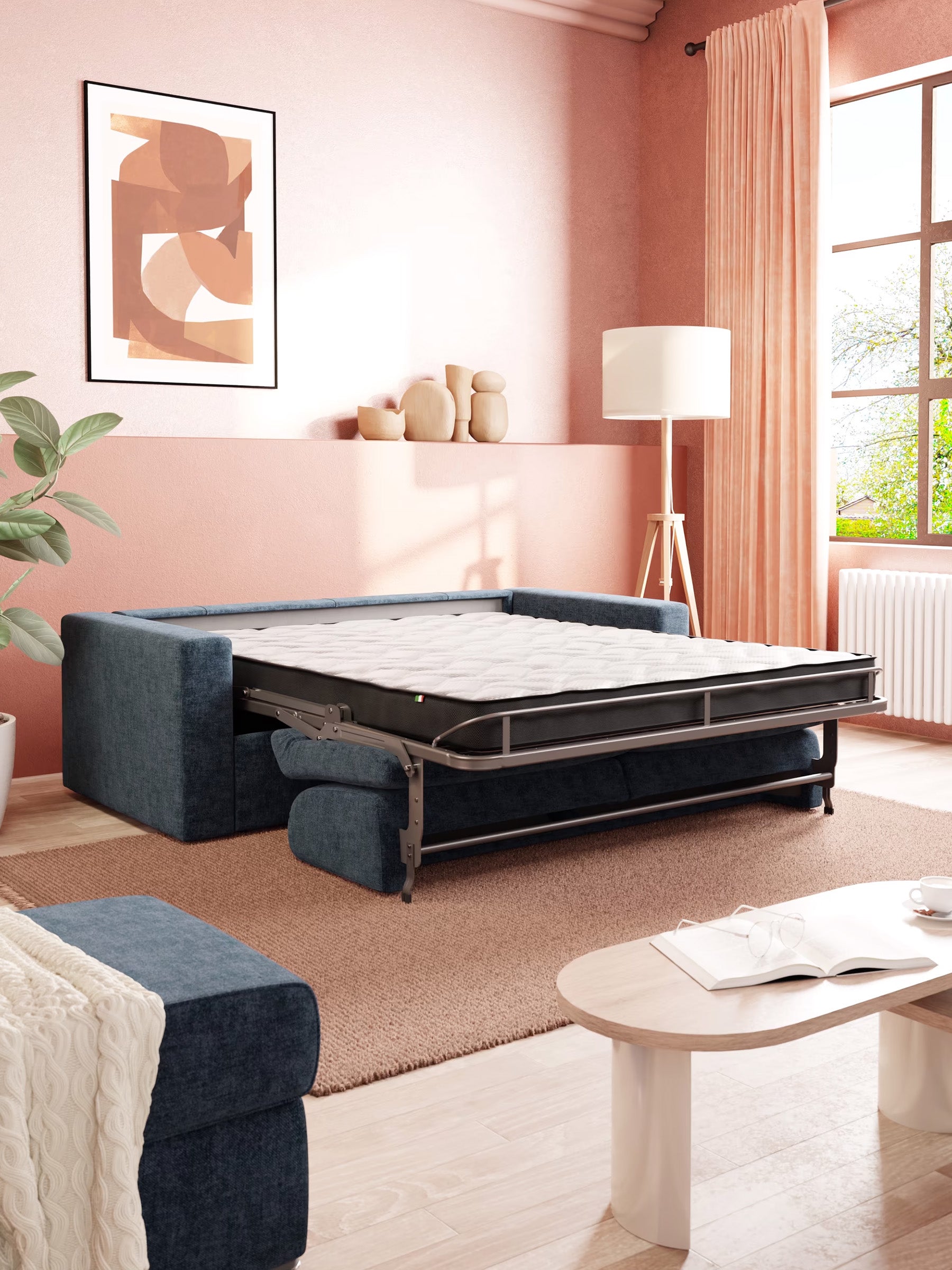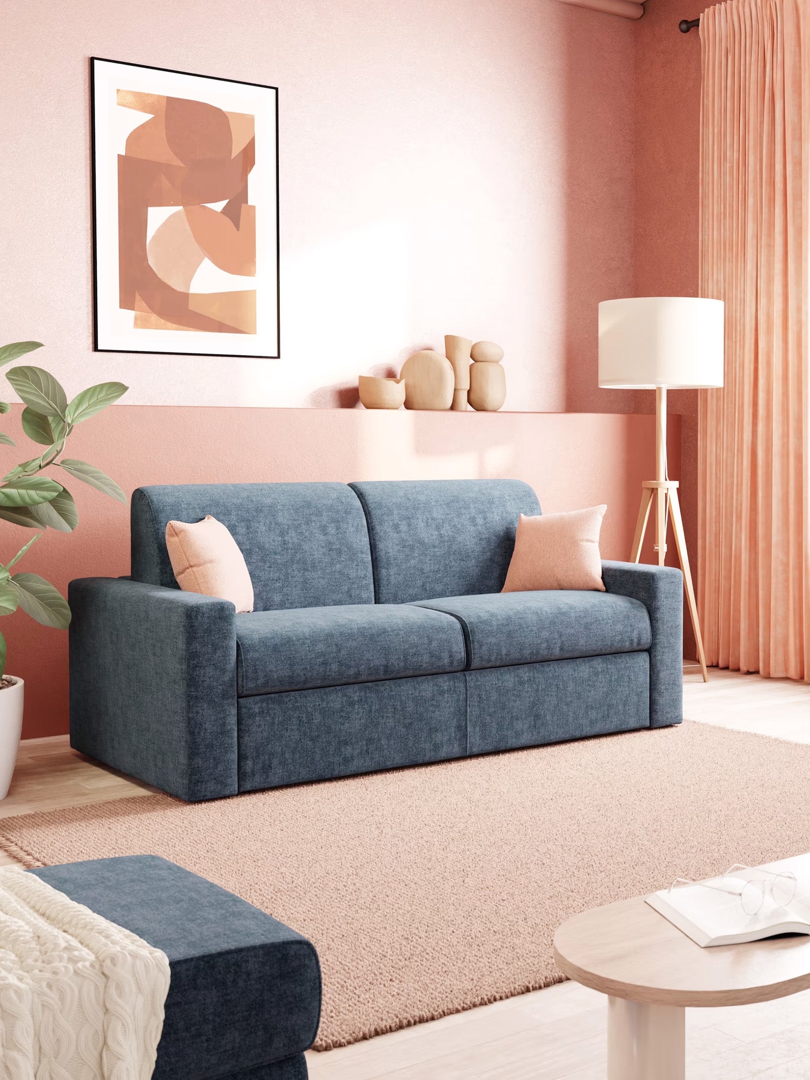 Der Klappmechanismus ermöglicht ein leichtgängiges und schnelles Öffnen, wodurch sich das Sofa in wenigen Sekunden in ein gemütliches Bett verwandelt. Serienmäßig ist eine 14 cm dicke Matratze mit hoher Dichte (35 kg/m³) enthalten, die in zwei Ausführungen erhältlich ist: