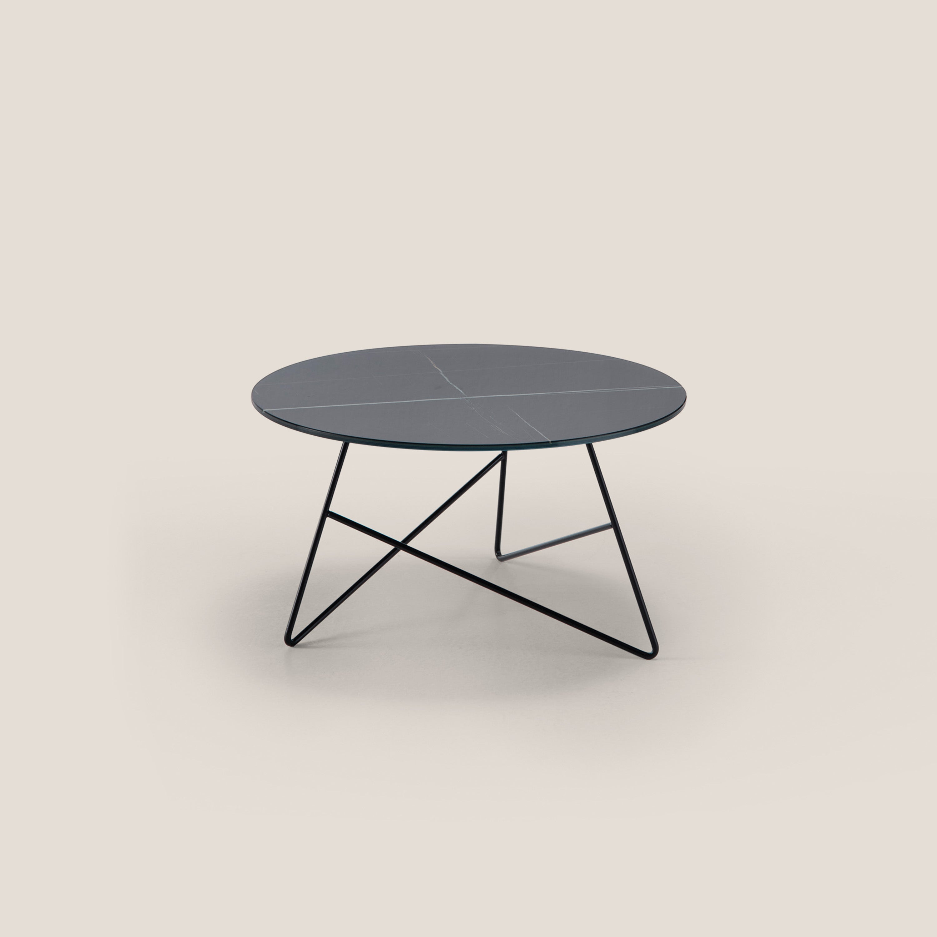 Ermione ist ein runder Couchtisch aus Metall mit einer Glasplatte aus schwarzem Marmor sahara black. Ein robustes und elegantes Design mit einer leichten und soliden Struktur, die sich endlos rund dreht. Ausgestattet mit Beinen in 2 raffinierten Ausführungen, Schwarz und Kupfer, für einen raffinierten und exklusiven Look. Eine elegante Wahl, die jede Einrichtung aufwertet.
