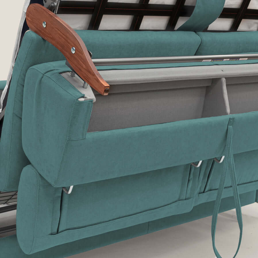 Bei beiden Lattenrosten haben wir einen Mechanismus mit elastischen Bändern am Ende verwendet, um mehr Komfort zu gewährleisten. Dies ermöglicht auch ein bequemes Sitzen, wenn das Bett geschlossen ist. Die Rückenlehne mit Eisenrahmen in den Modellen mit Kissenfach gewährleistet eine ewige Haltbarkeit.