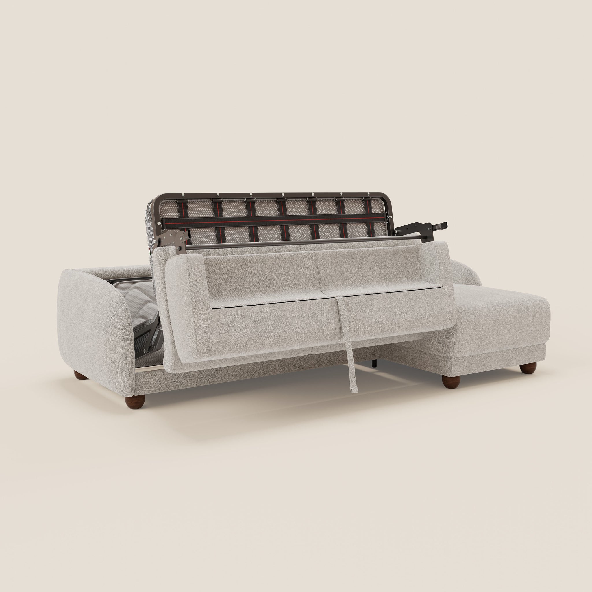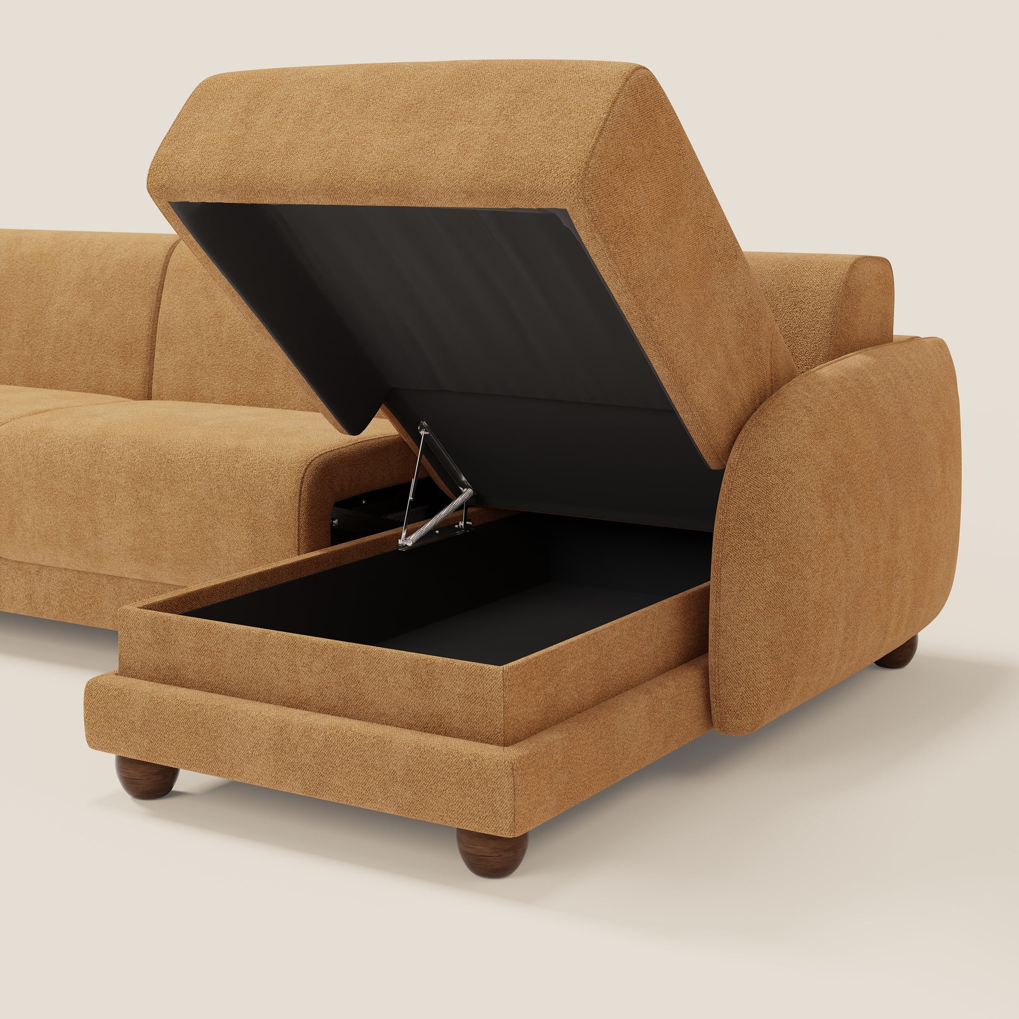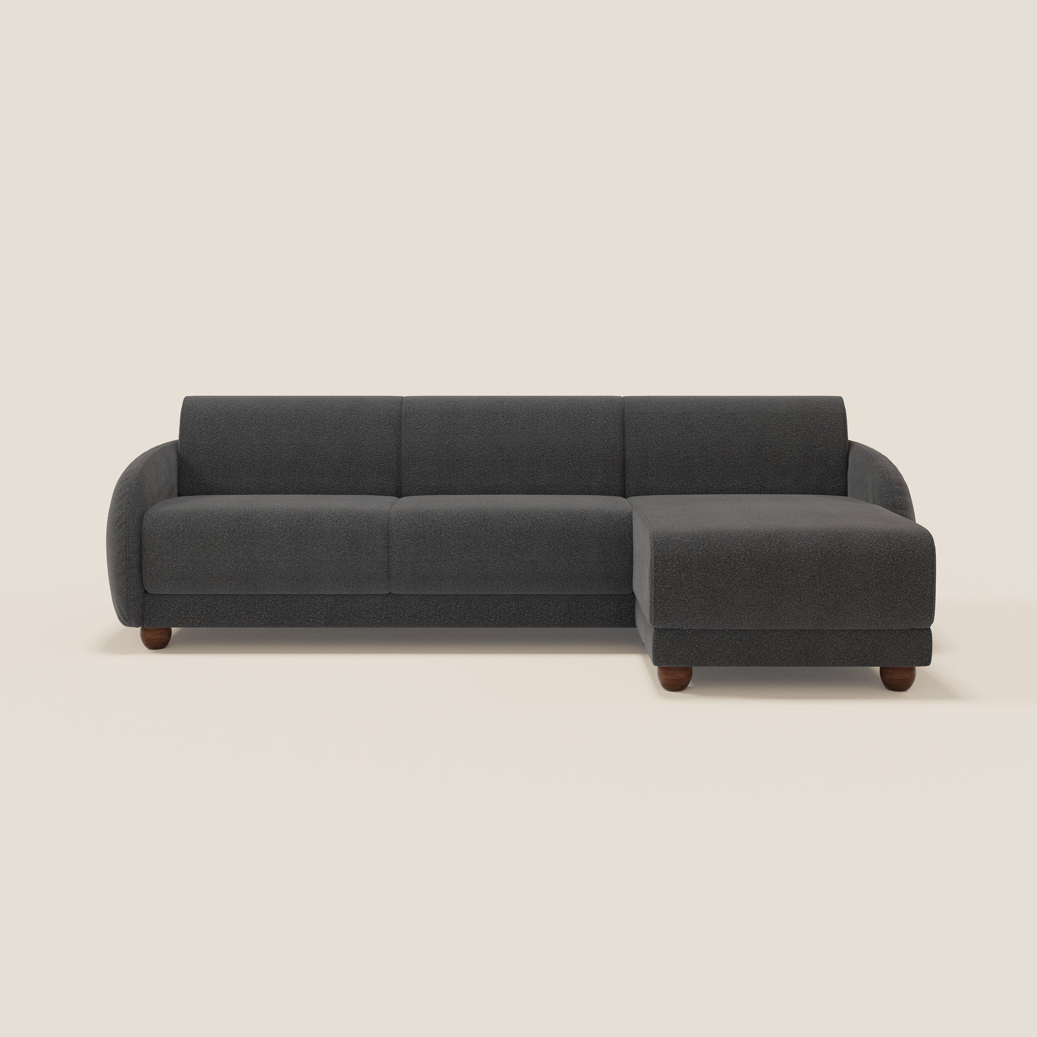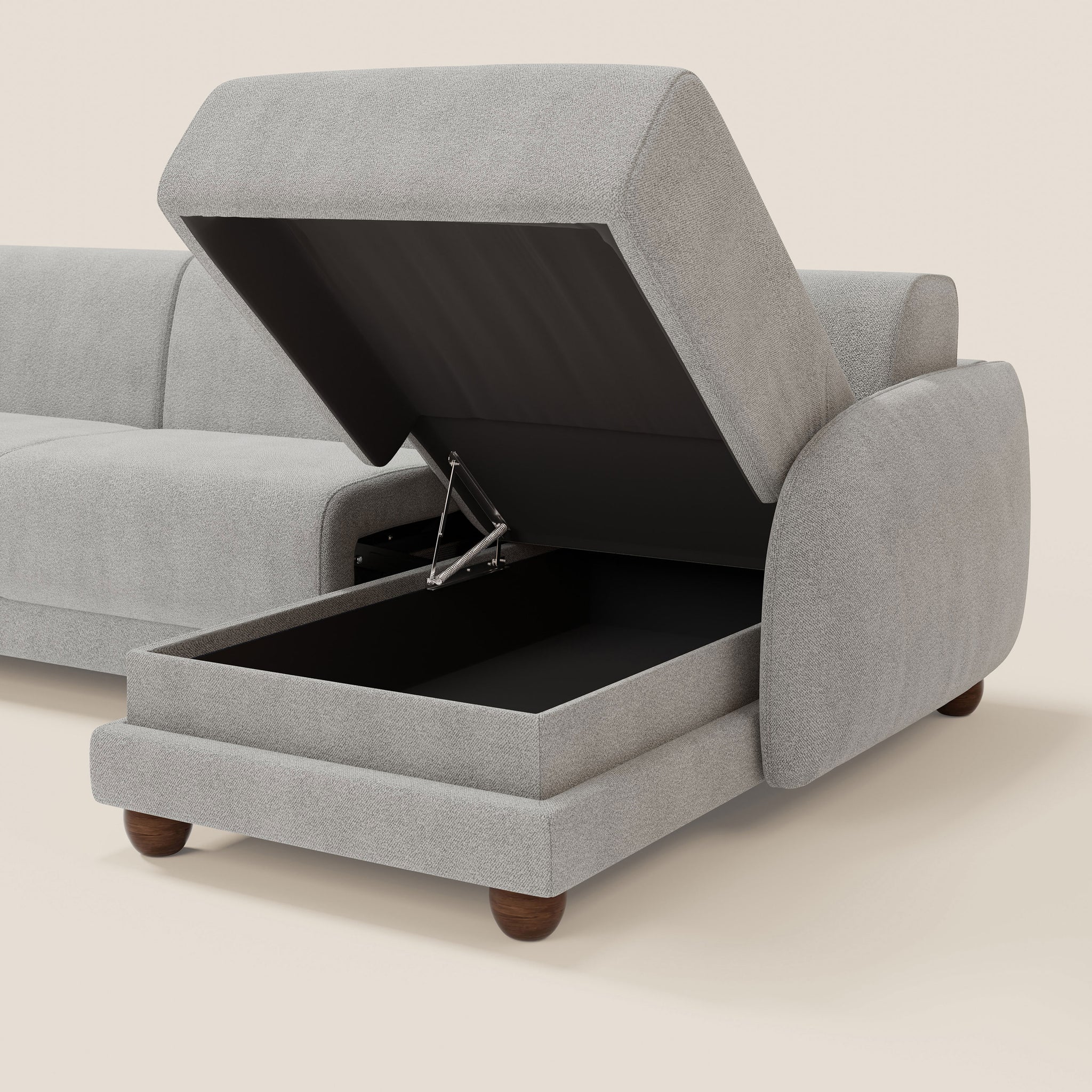 GIGLIO ecksofa vereint Japandi-Stil, Komfort und Funktionalität in einem einzigen Schlafsofa mit Stauraum. Ausgestattet mit einer 18 cm hohen Matratze und einem elektrogeschweißten Lattenrost bietet es auch im täglichen Gebrauch optimalen Schlafkomfort. Der wasserabweisende Bouclé-Bezug und die 8 cm hohen Füße aus Nussbaumholz unterstreichen die natürliche Eleganz des Modells. Die geschwungenen Armlehnen und die kompakten Linien machen es ideal für moderne und minimalistische Umgebungen.