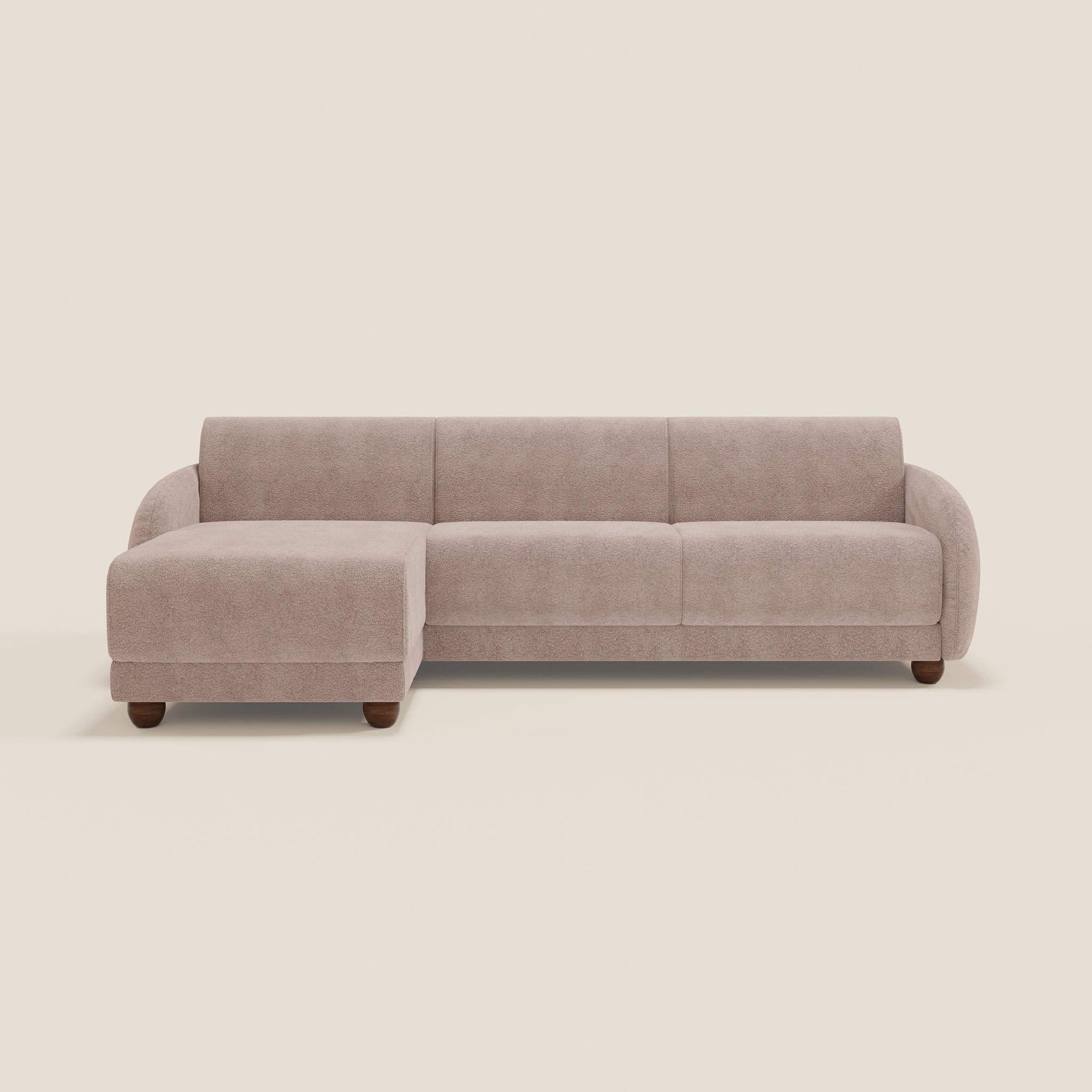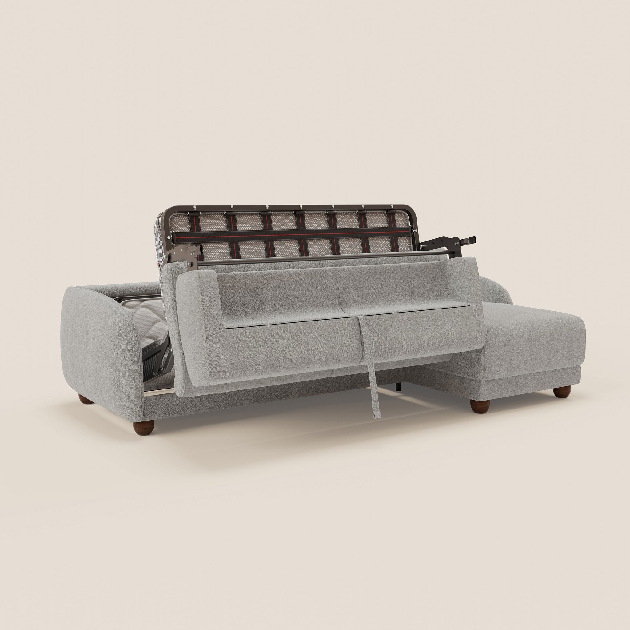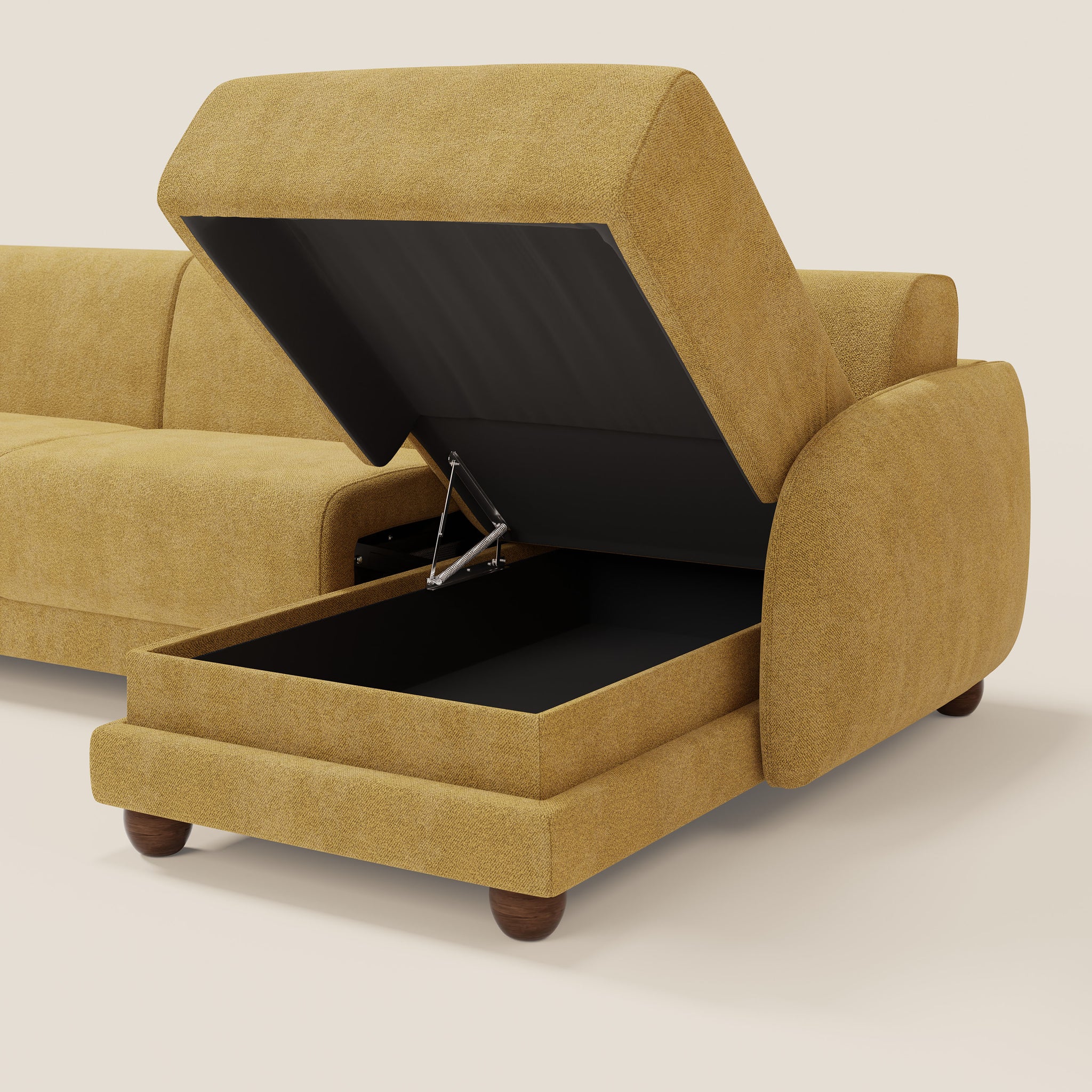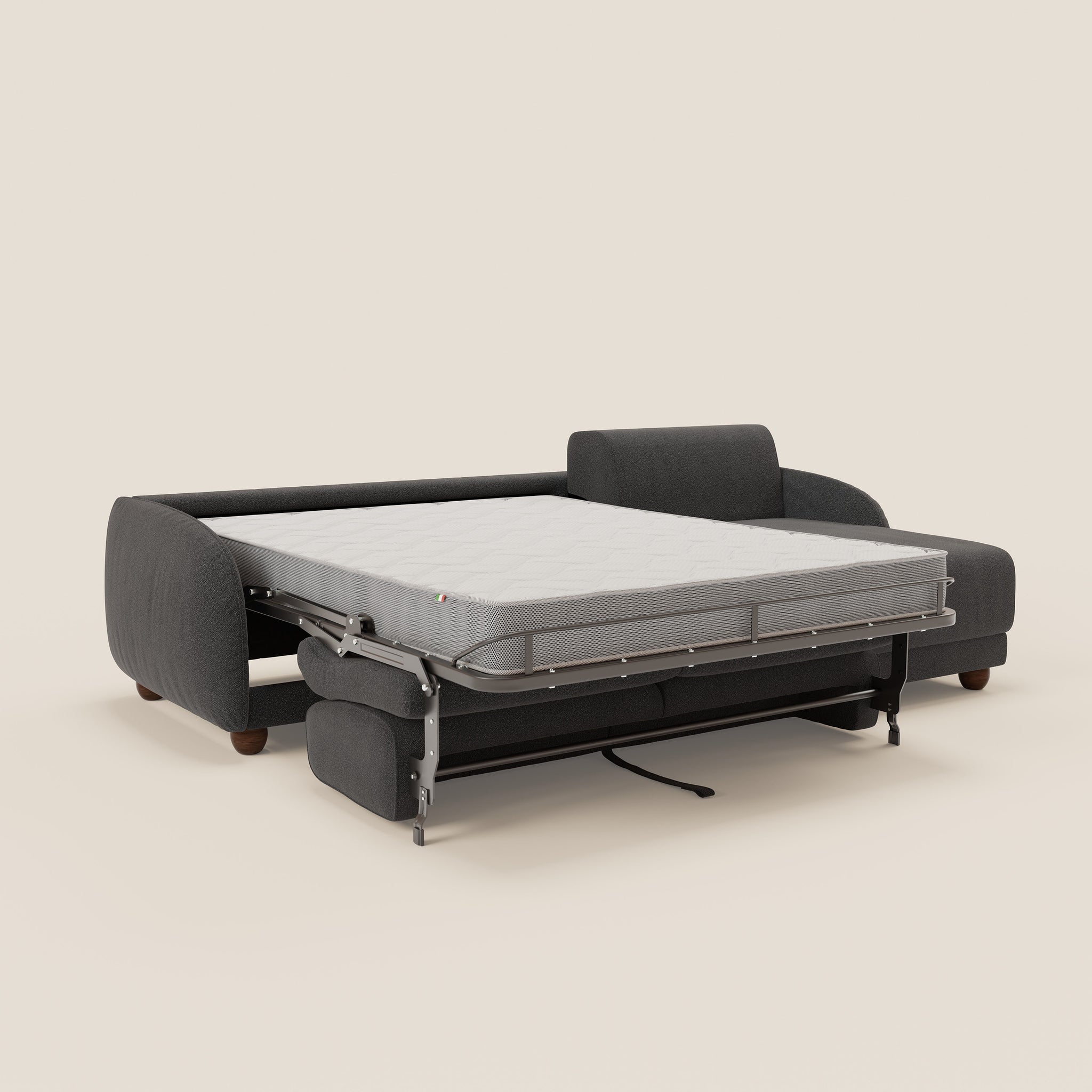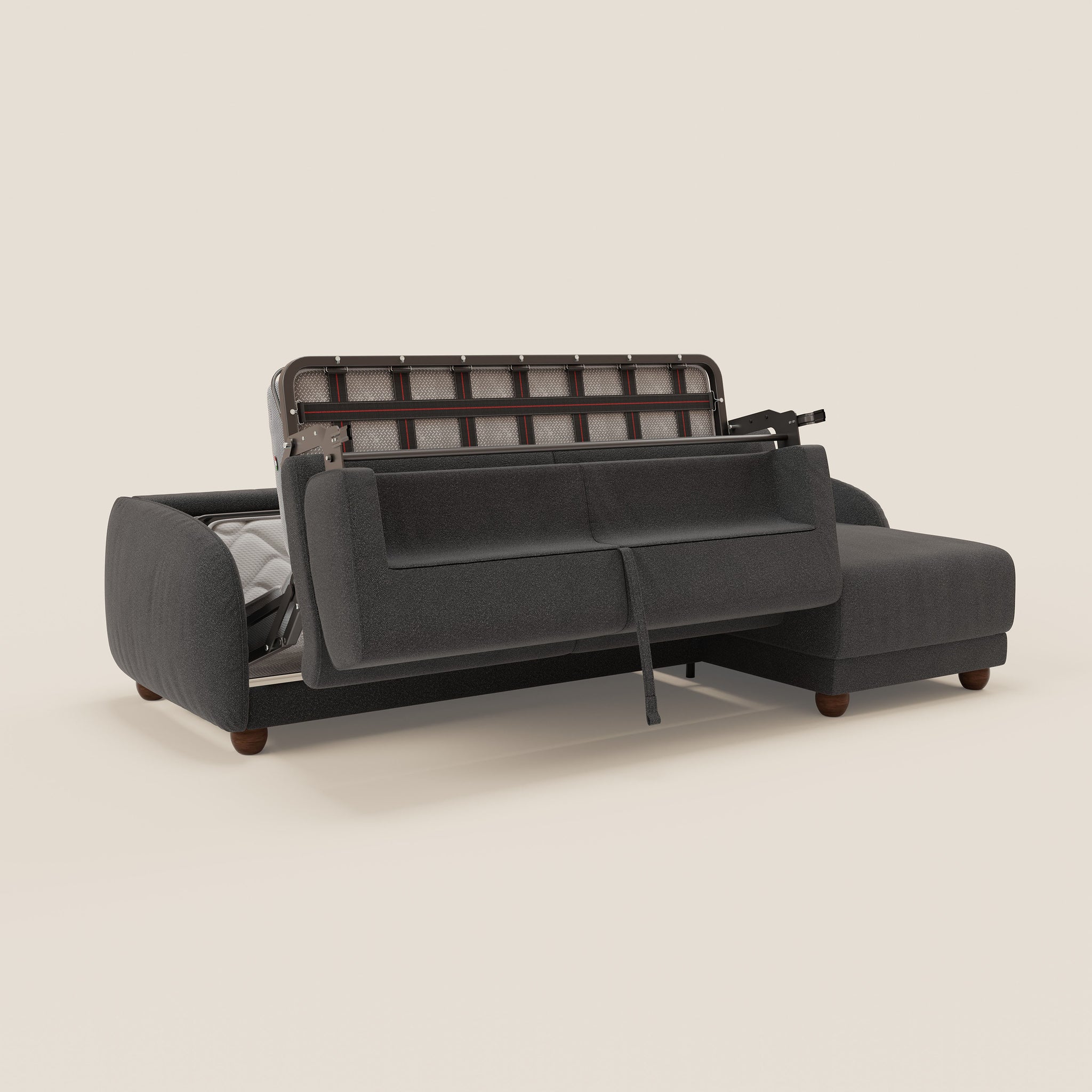 GIGLIO ecksofa vereint Japandi-Stil, Komfort und Funktionalität in einem einzigen Schlafsofa mit Stauraum. Ausgestattet mit einer 18 cm hohen Matratze und einem elektrogeschweißten Lattenrost bietet es auch im täglichen Gebrauch optimalen Schlafkomfort. Der wasserabweisende Bouclé-Bezug und die 8 cm hohen Füße aus Nussbaumholz unterstreichen die natürliche Eleganz des Modells. Die geschwungenen Armlehnen und die kompakten Linien machen es ideal für moderne und minimalistische Umgebungen.