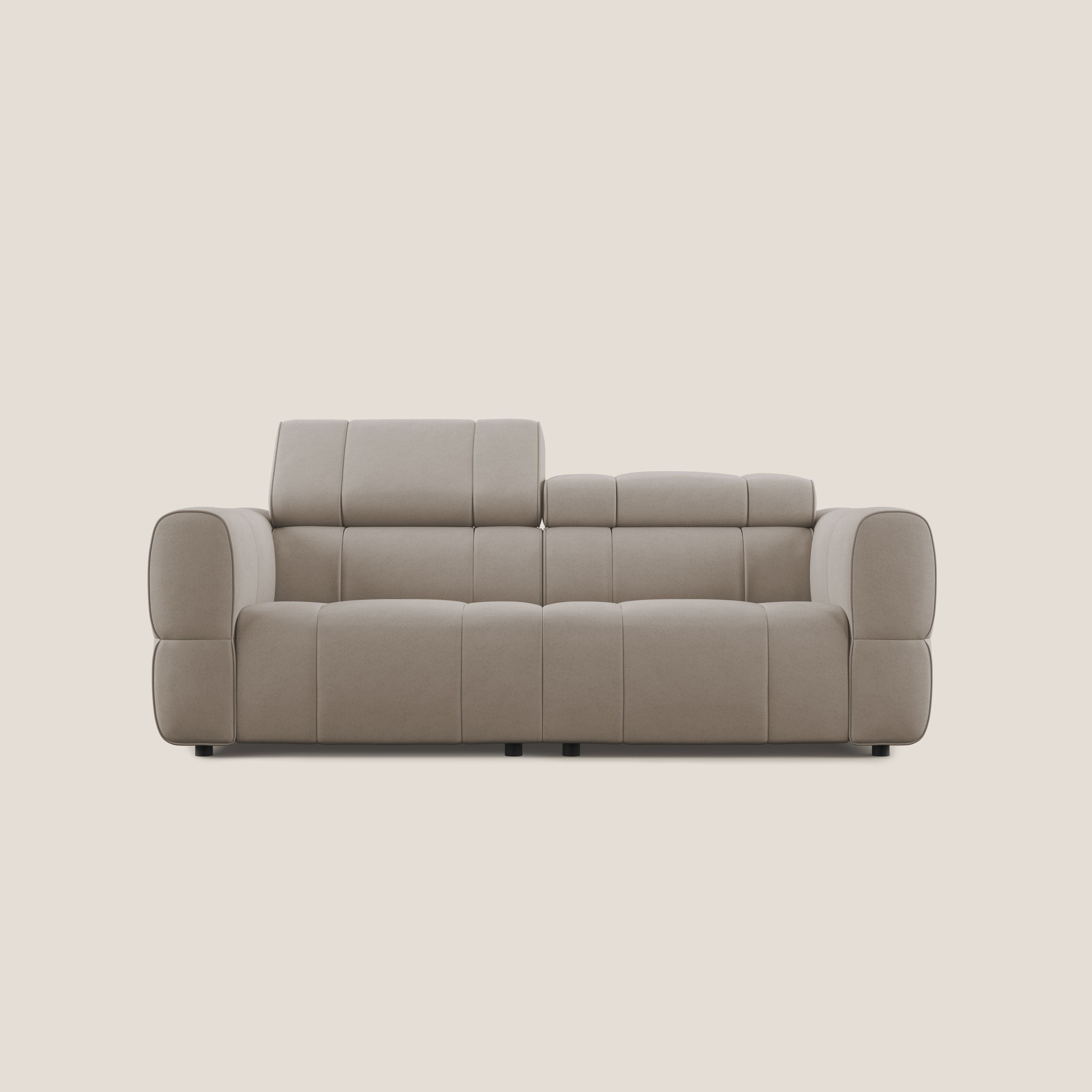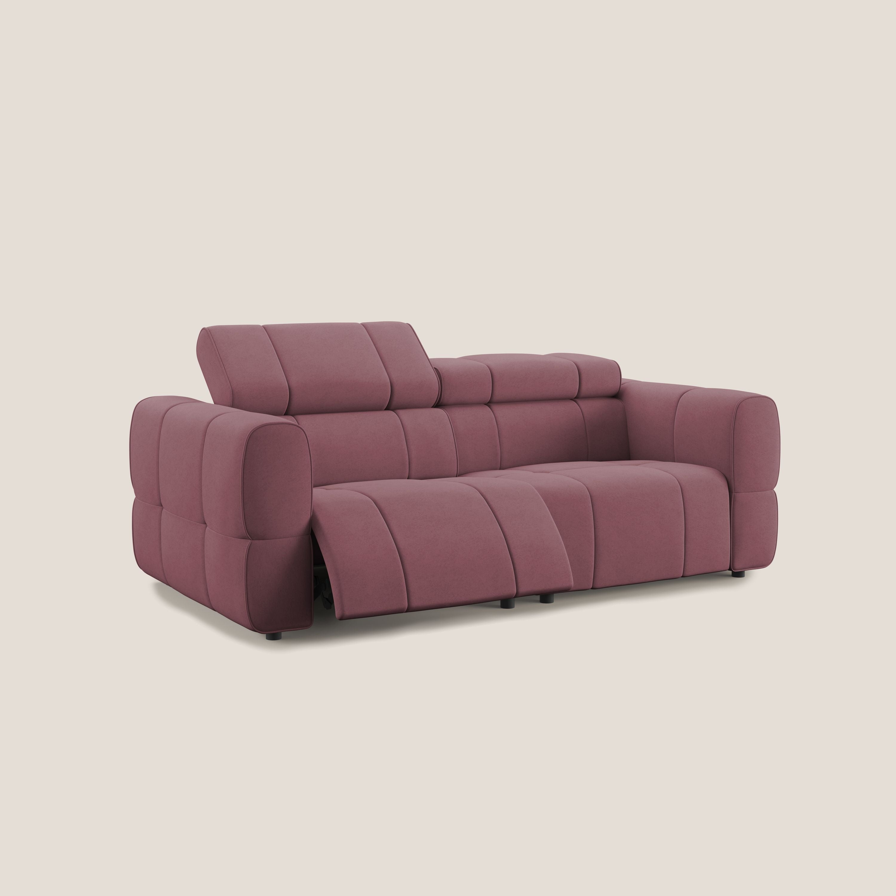 Er kann nach Wunsch konfiguriert werden, wobei auch die Version mit elektrischem Relaxmechanismus gewählt werden kann, der maximalen Komfort garantiert. Der elektrische Mechanismus mit internem Druckknopf-Panel ist mit der 0-Wall-Technologie ausgestattet, mit der Möglichkeit, ihn nahe an der Wand zu platzieren, so dass in der maximalen Entspannungsposition die hintere Belastung nicht die Länge der Armlehne überschreitet. Sein moderner und eleganter Aspekt wird durch den wasserfesten und abwaschbaren Samtstoff unterstrichen, der in einer Palette von zarten Pastelltönen erhältlich ist. Ein luxuriöses Modell mit einer hohen Rückenlehne, die durch die Kopfstützen, die nach Belieben verstellt werden können, und durch die Nähte, die das gesamte Modell veredeln und ihm einen Hauch von Exklusivität verleihen.