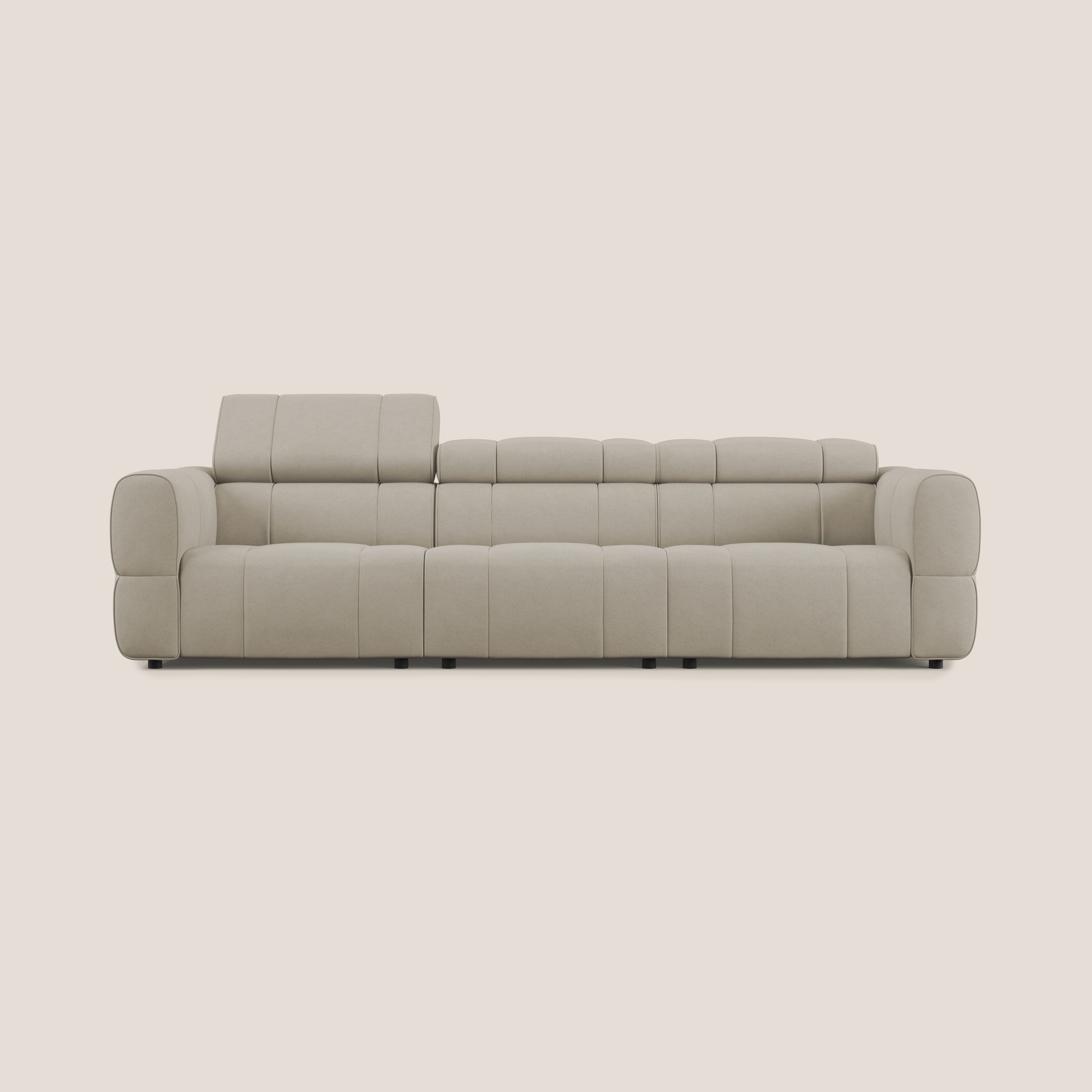 Das Modell GIOTTO ist ein einladendes, modulares Sofa mit raffinierten Linien, das sorgfältig mit einer italienischen Verarbeitung und Capitonné-Effekt gefertigt wurde, um abgerundete Formen und eine perfekte Verschmelzung von Schönheit, Komfort und Funktionalität zu schaffen. Die weiche Polsterung mit hoher Dichte ist mit einer Memory-Schaumschicht angereichert, die für einen einhüllenden und extrem weichen Komfort sorgt. Ausgestattet mit weichen Kopfstützen, die manuell in 7 Stufen mit einem Ratschenmechanismus eingestellt werden können, um sich jedem Bedarf anzupassen.