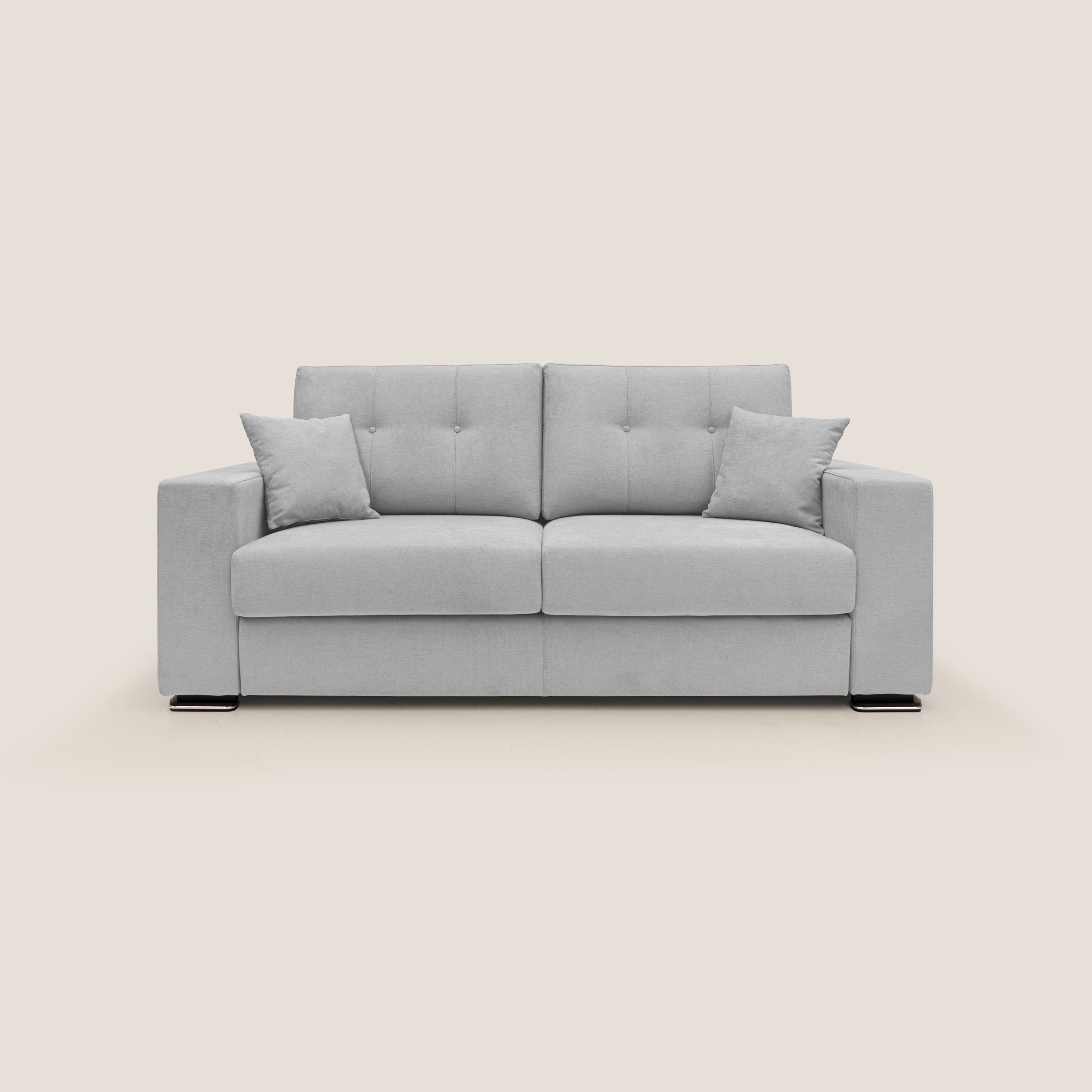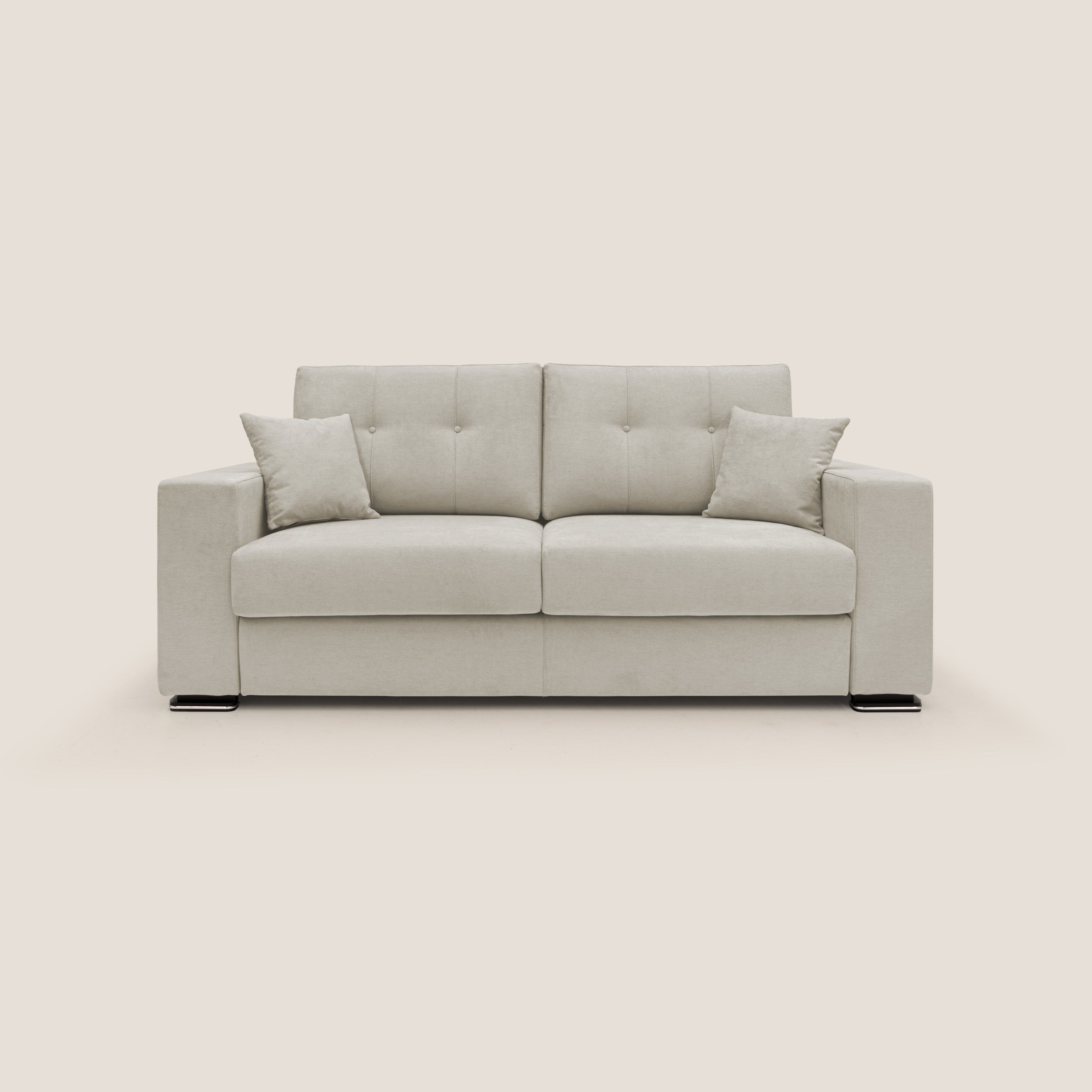 GIOVE, Ein Sofa im minimalistischen Stil, das als 3- oder 2-Sitzer erhältlich ist. Seine italienische Herstellung und seine Struktur aus Agglomeratholz und Tannenholz sind eine Garantie für Robustheit. Der weiche, wasserfeste Stoff ist in der Lage, Flecken zu entfernen, bevor sie vom Stoff aufgesaugt werden, und ist sogar bei 30° waschbar. Der Bezug, der sich weich anfühlt, ist mit seinen samtigen Eigenschaften nicht als zu dick anzusehen, sondern im Gegenteil, er ist für jede Jahreszeit geeignet.