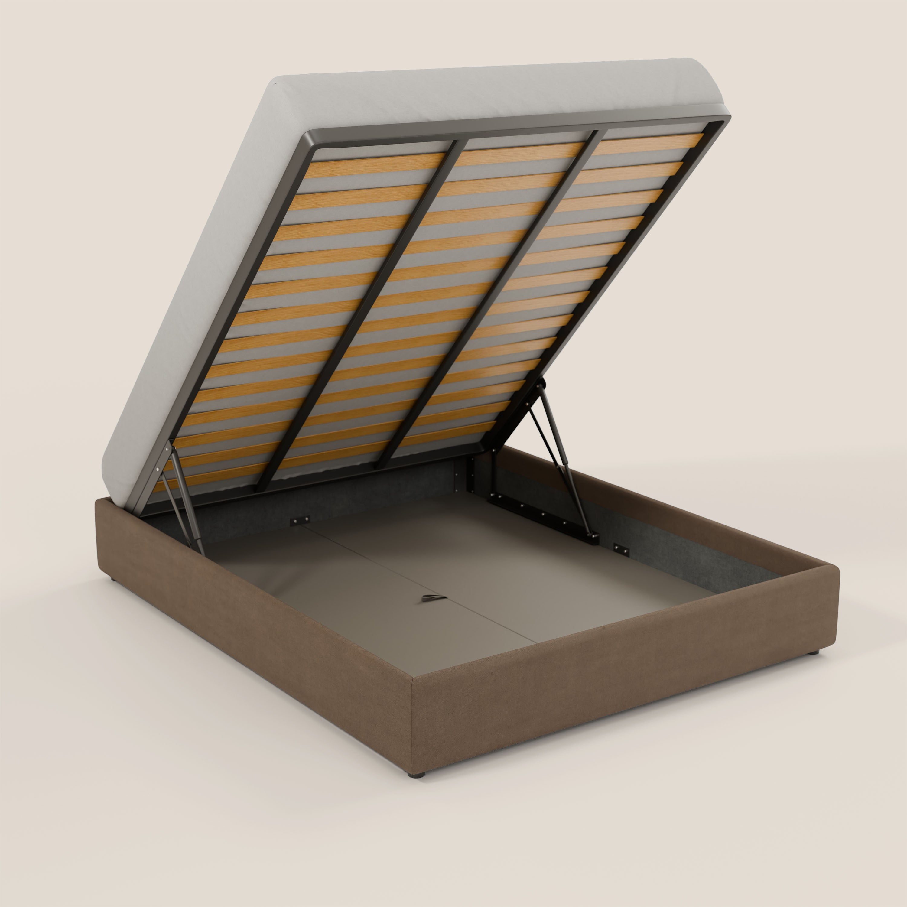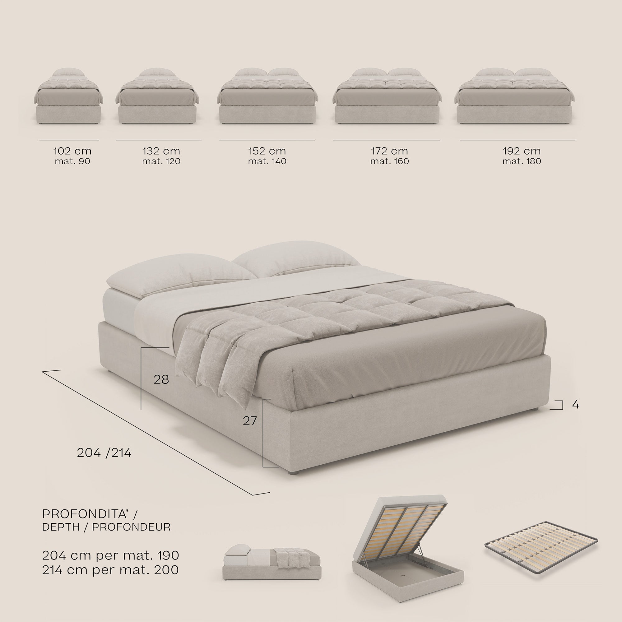 - Großes Staufach: einfaches und sofortiges Öffnen, sehr widerstandsfähige beschichtete Mdf-Böden, die mit speziellen Griffen zur einfachen Reinigung unter dem Bett herausgenommen werden können.