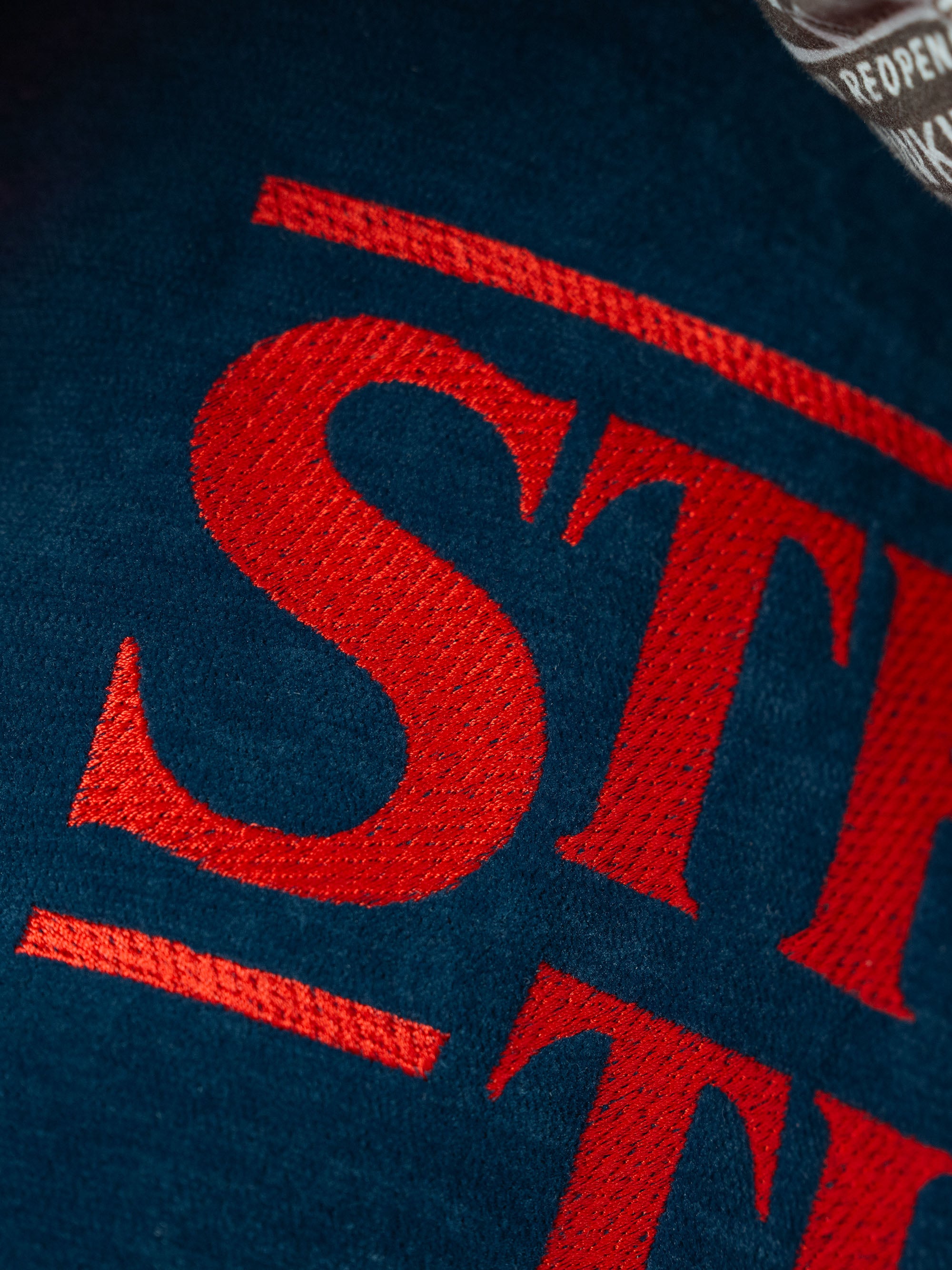 Das absolute Highlight ist das gestickte „Stranger Things“-Logo, das aus hochwertigen Garnen gefertigt ist und dem ikonischen Schriftzug der Serie Tiefe und Kontur verleiht. Erhältlich in drei Farbvarianten – Rot, Blau und Anthrazitschwarz – kombiniert mit kontrastierender Stickerei und einem Reißverschluss, der farblich auf das Logo abgestimmt ist, für ein elegantes und raffiniertes Farbdetaill.