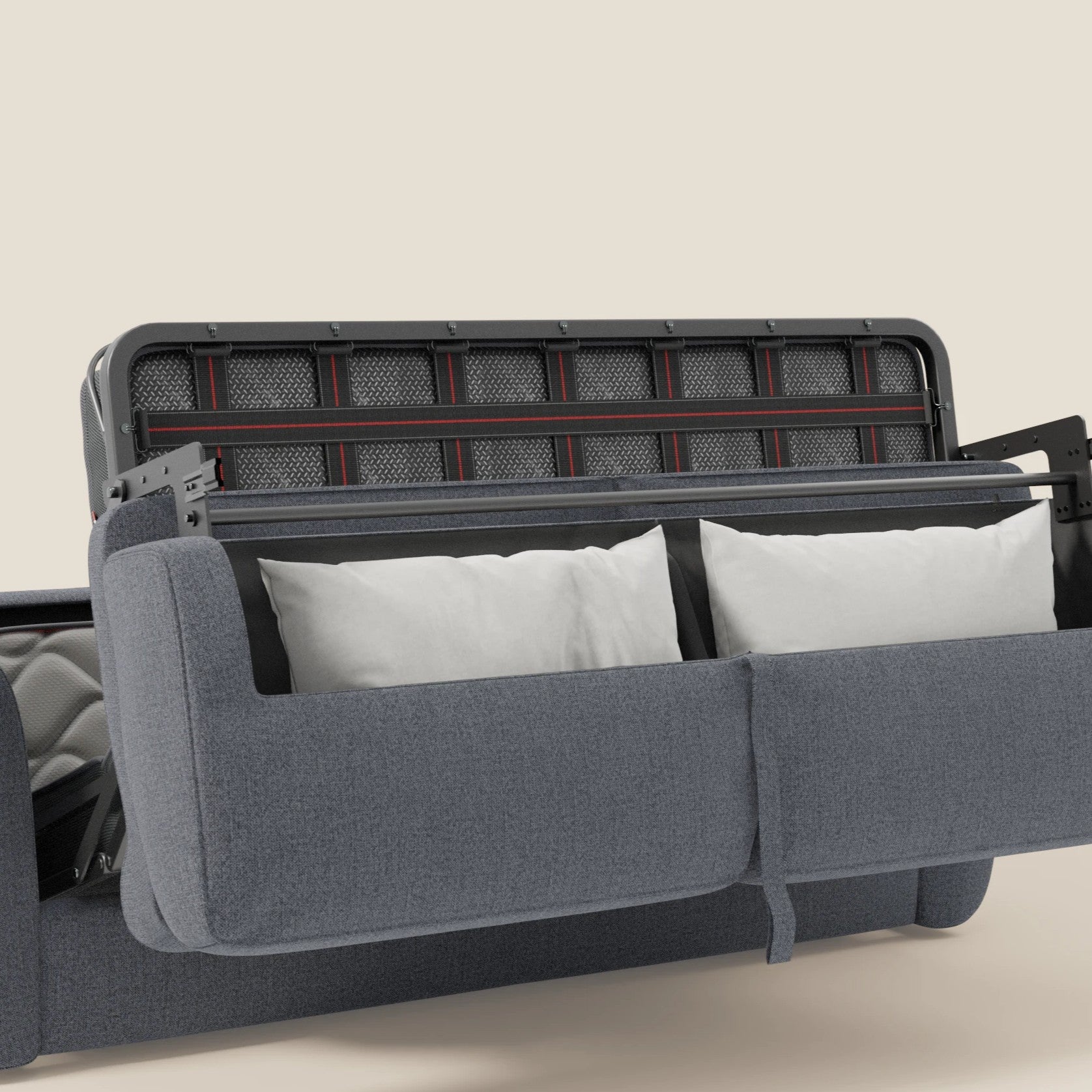 Mechanismus : Innovatives Klappensystem, das mit einer einfachen Bewegung das Öffnen des Mechanismus ermöglicht, ohne die Kissen von Sitz und Rückenlehne zu entfernen. Das Gestell ist aus hochfestem Möbelrohr mit Epoxy-Lackierung gefertigt, um zu verhindern, dass Teile korrodieren oder durch aggressive Mittel beschädigt werden