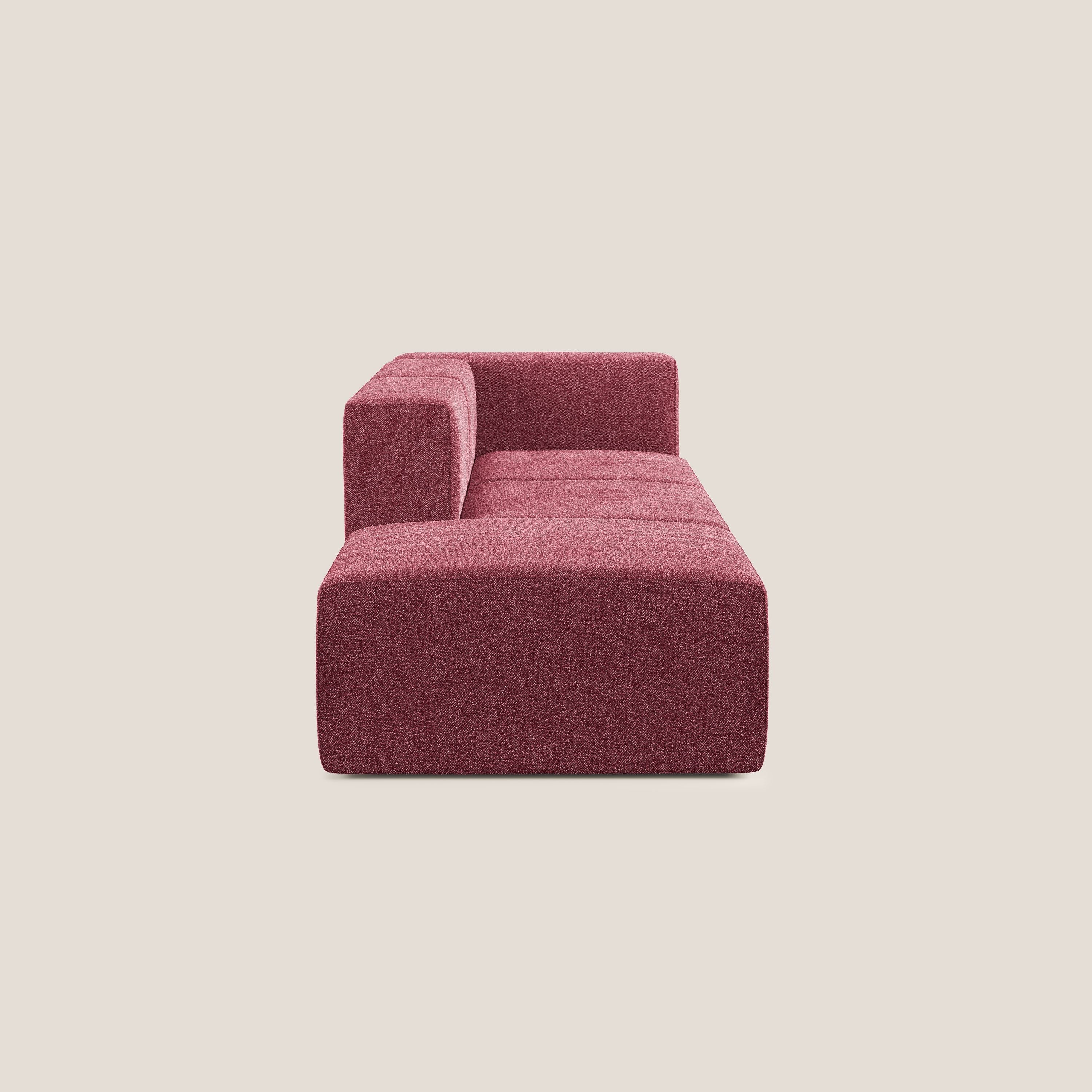 Sofa aus wasserfestem, weichem Bouclé-Stoff. Elemente mit Krokodilklemmen, um die Module zu verbinden und ein Verrutschen zu verhindern. Mit dieser Konfiguration erhalten Sie ein 240 cm langes lineares Sofa mit Hocker am Ende oder ein 170 cm langes lineares Sofa mit einem abnehmbaren Hocker, der bei Bedarf als zusätzlicher Sitzplatz genutzt werden kann.