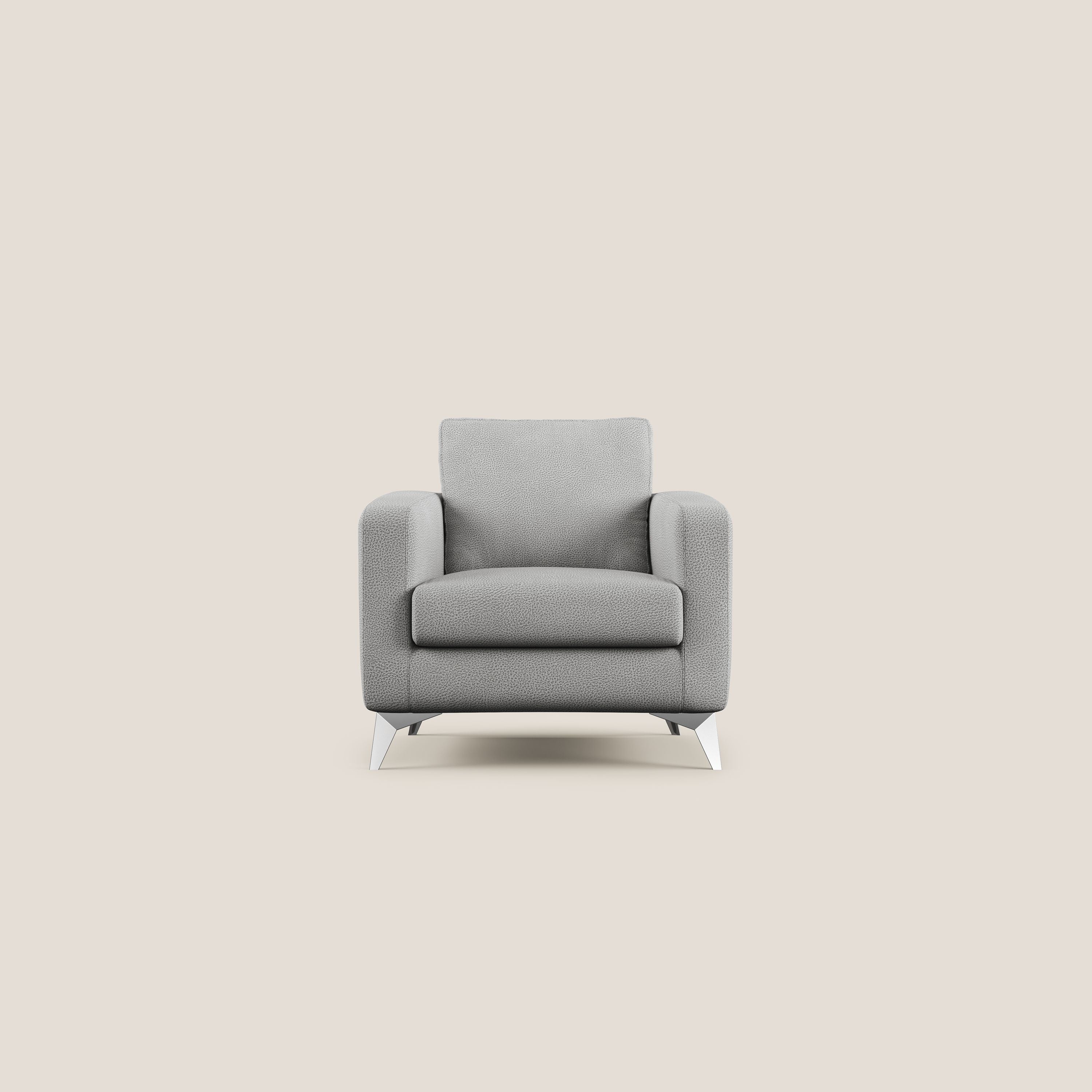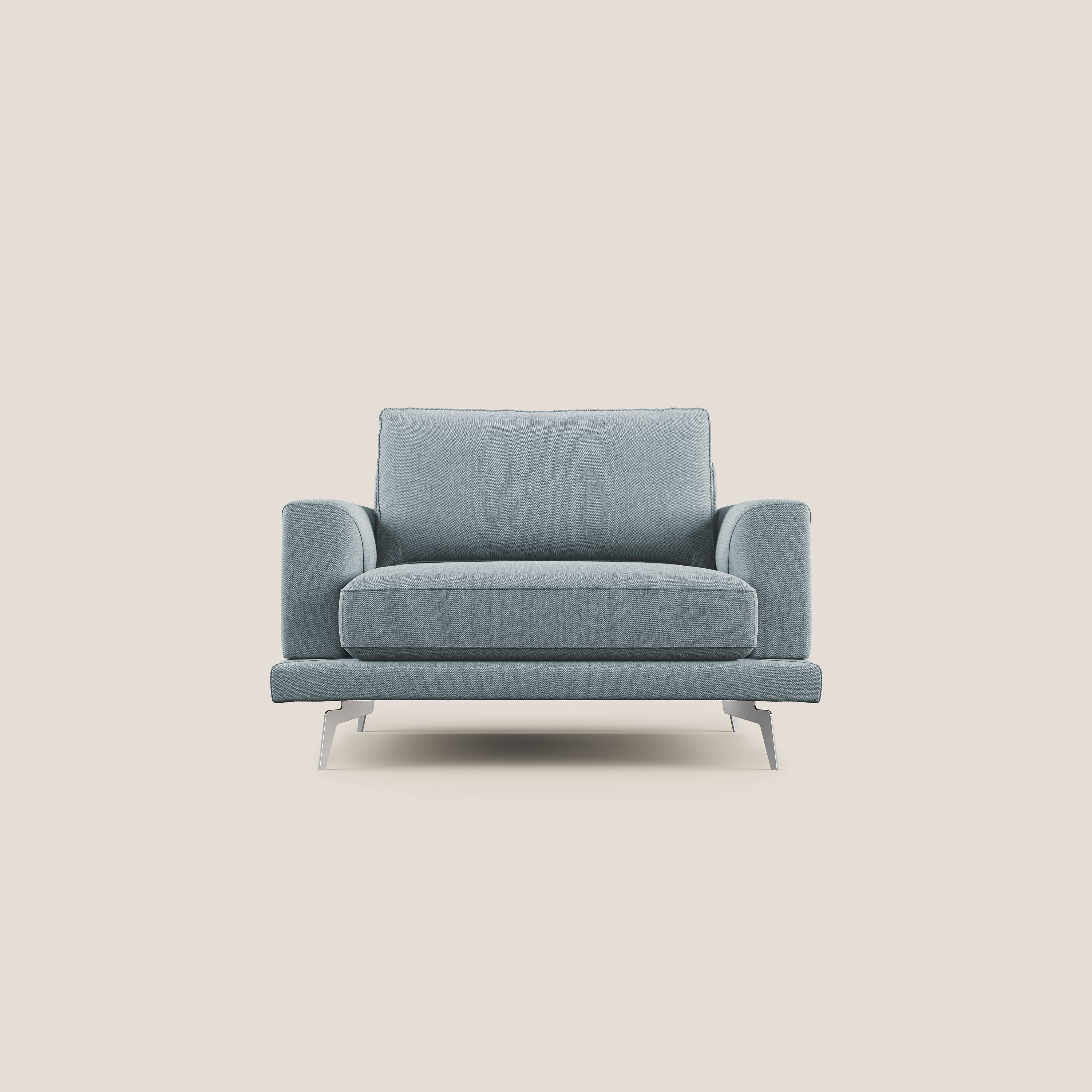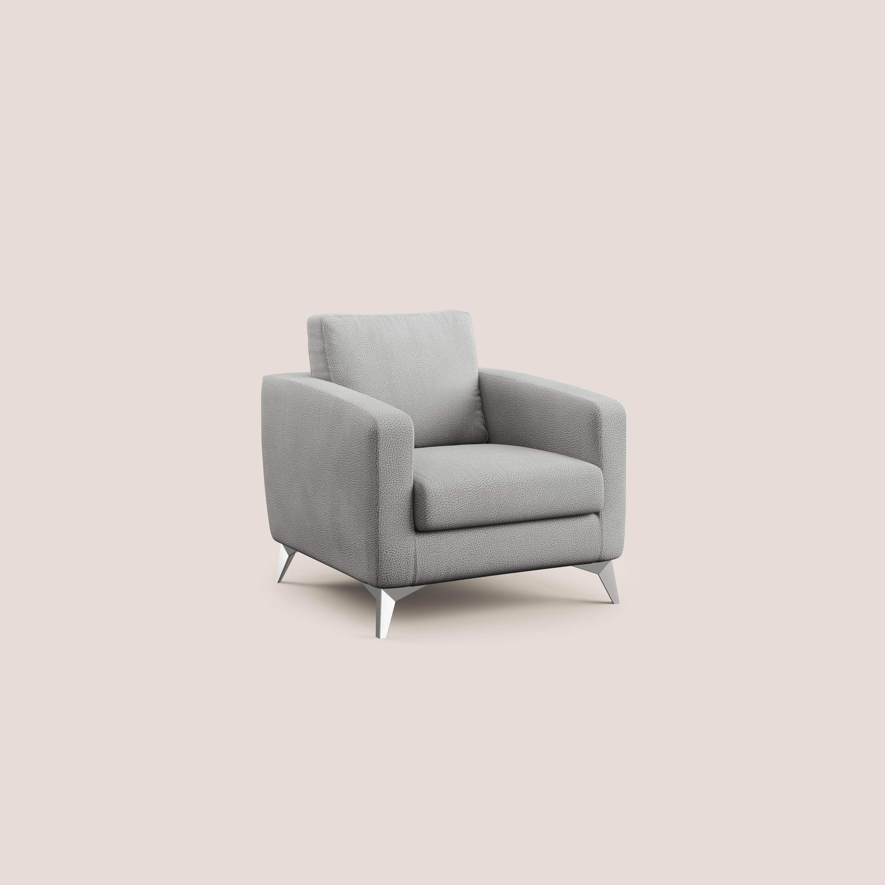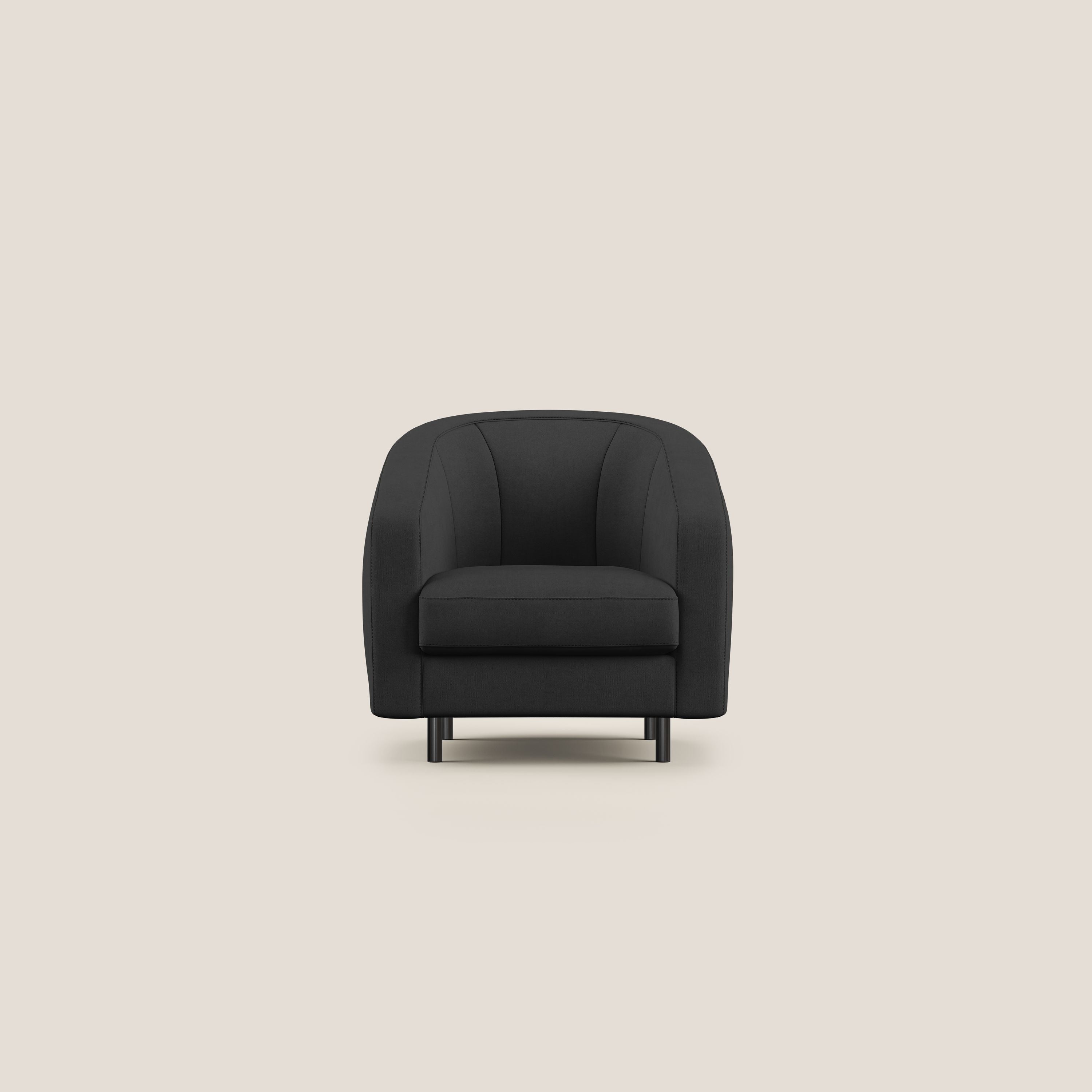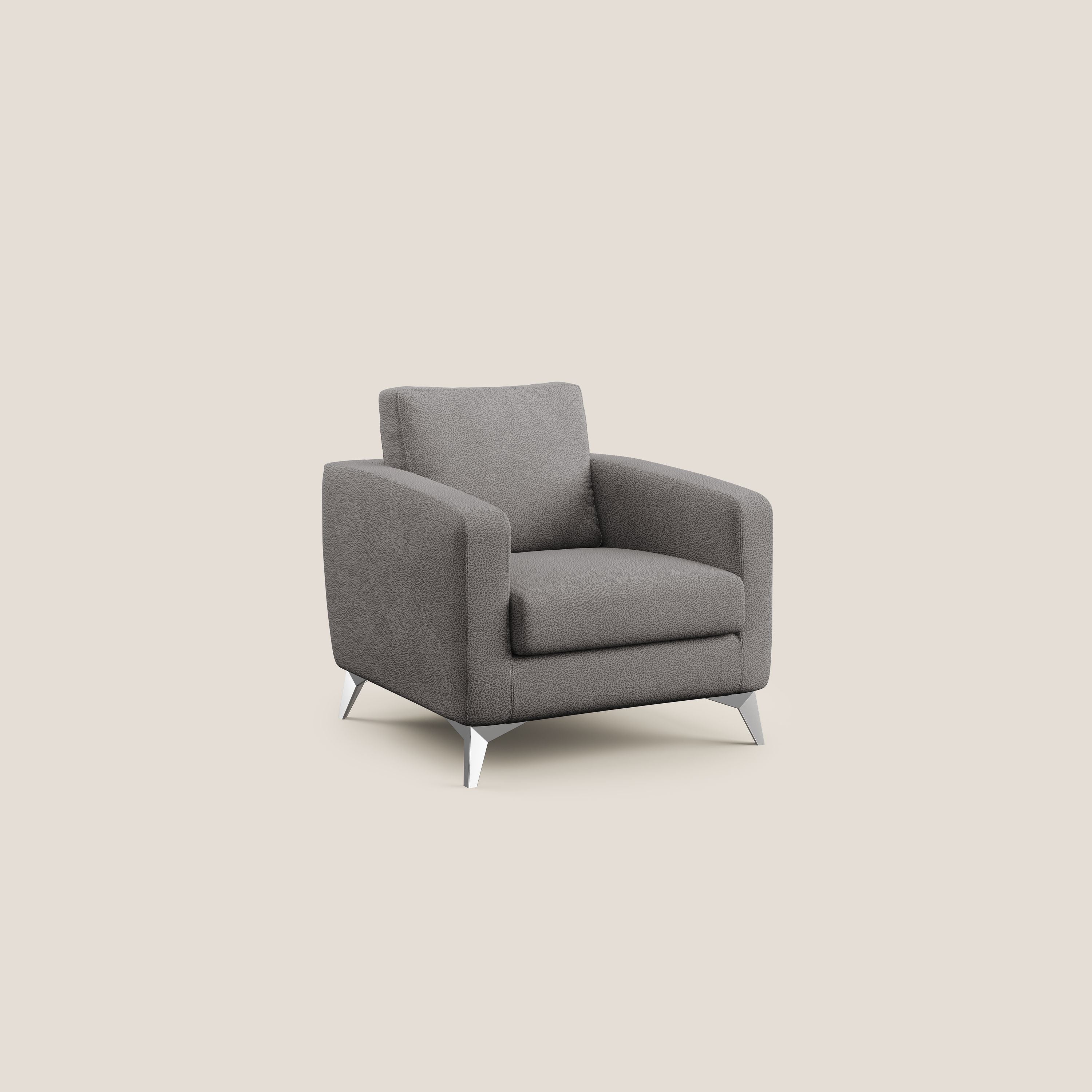 Sessel aus weichem, wasserfestem Stoff, mit 13 cm hohen schwarzen Stahlfüßen.