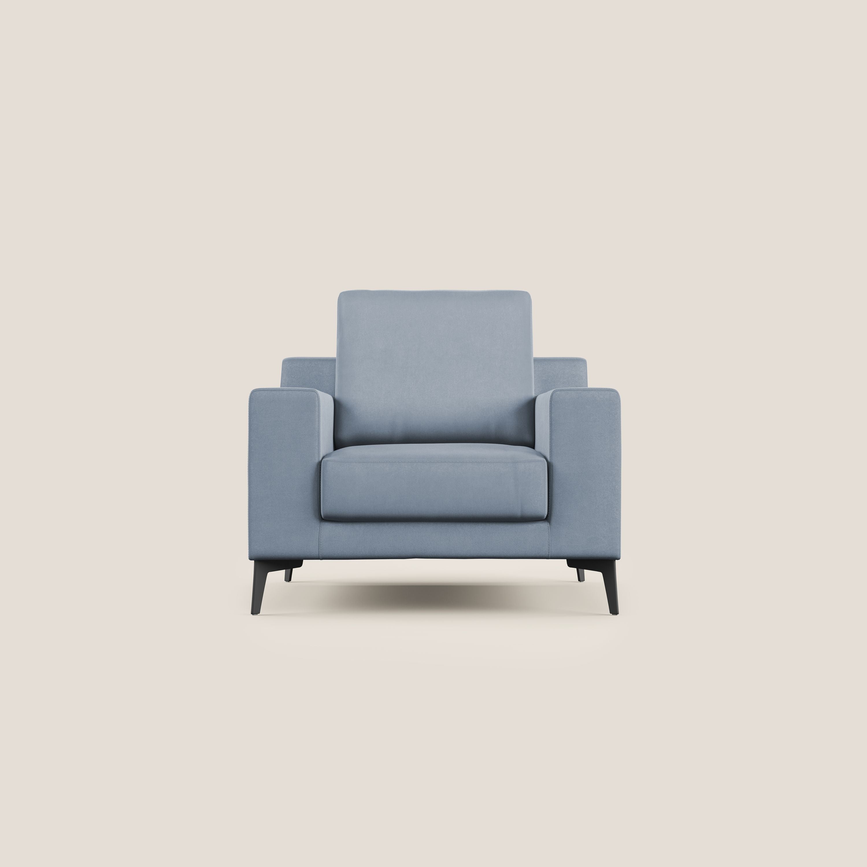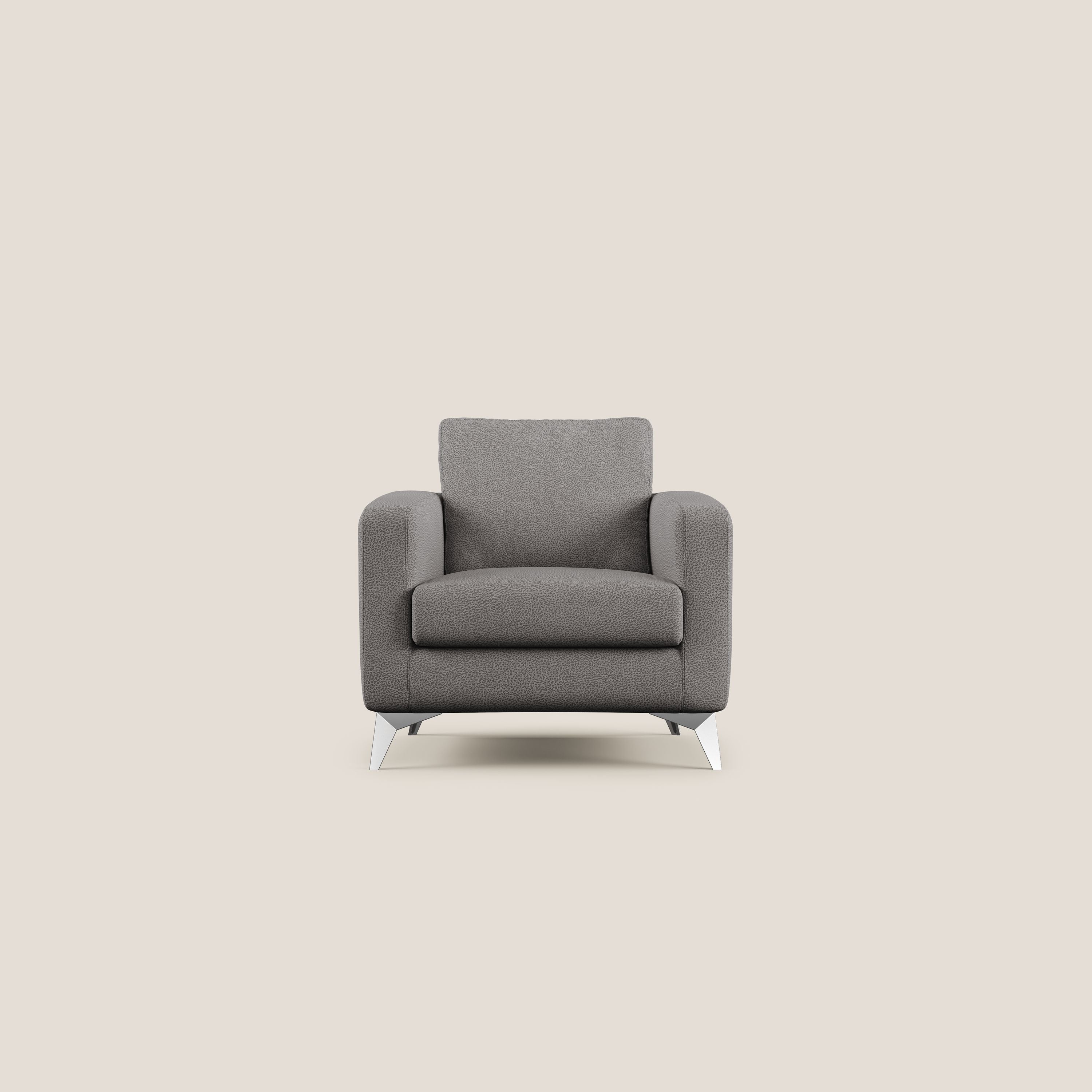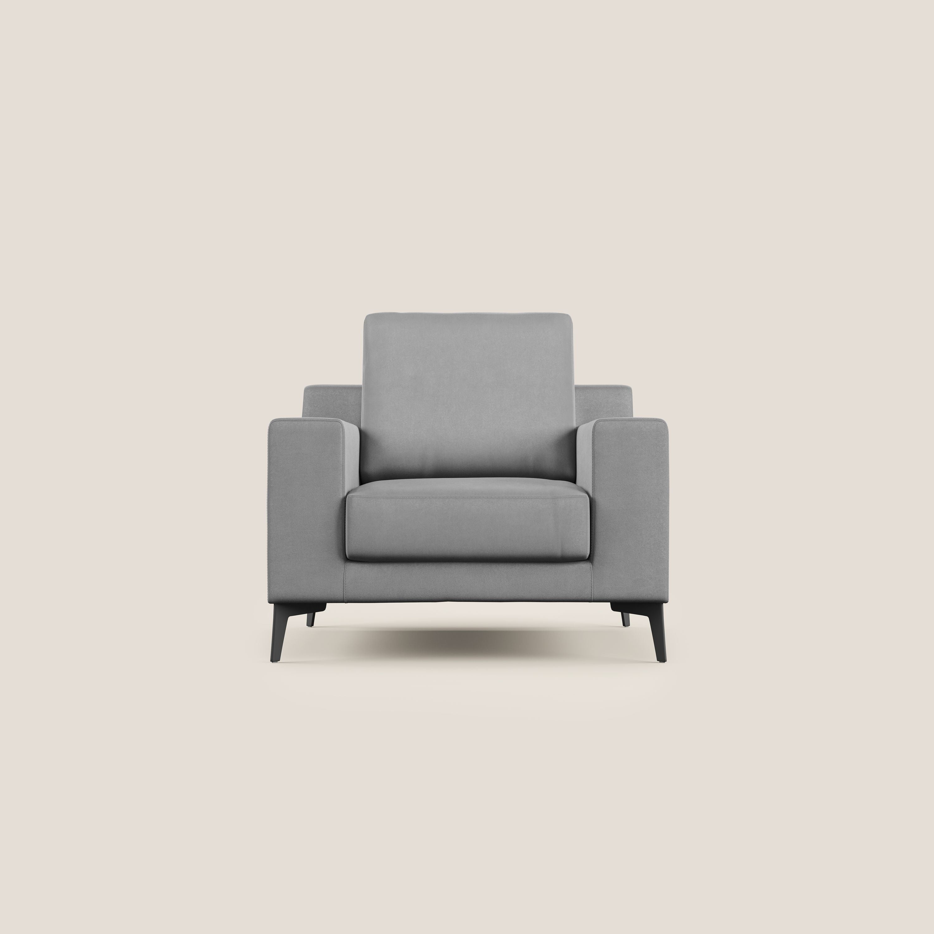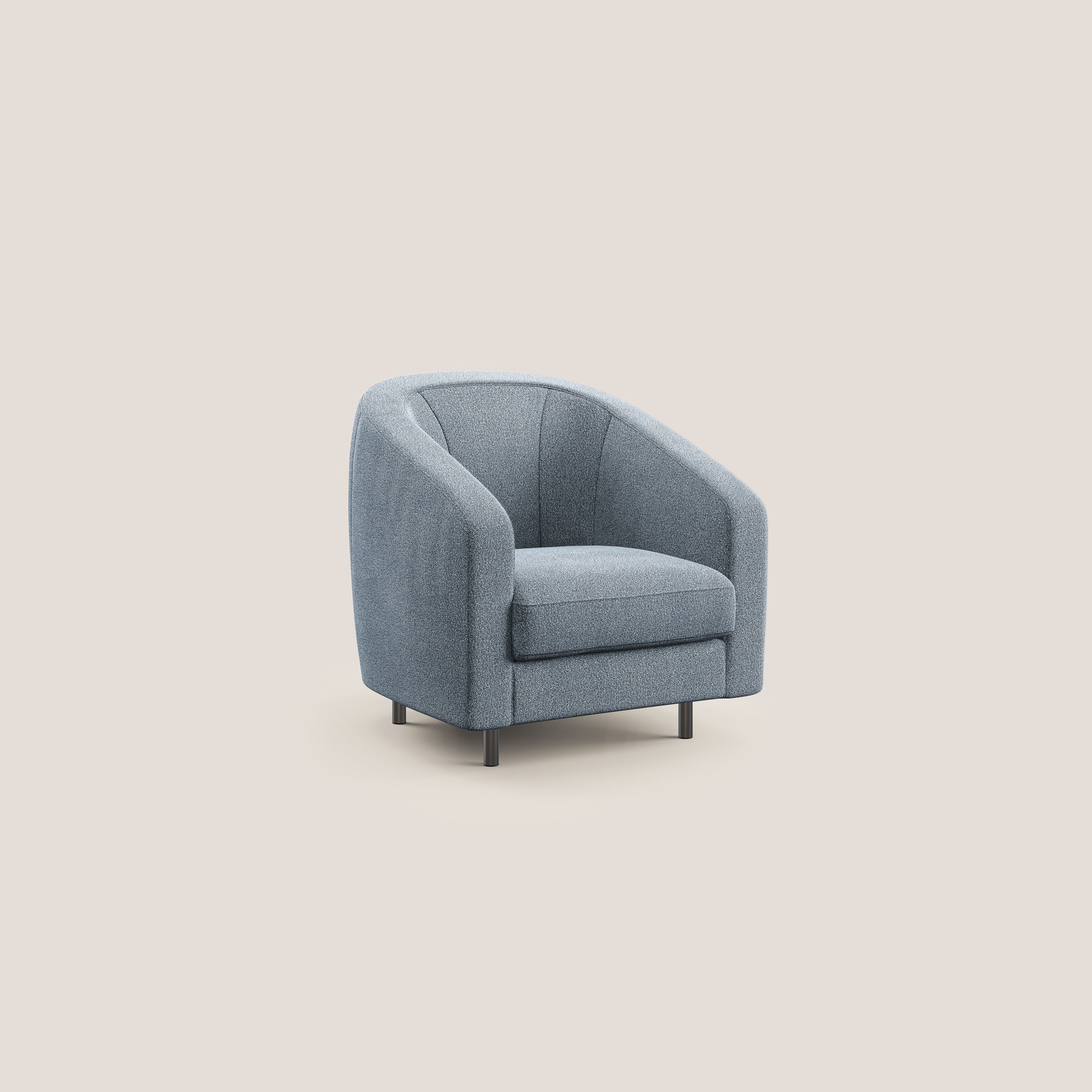 Sessel aus weichem, wasserfestem Stoff, mit 13 cm hohen schwarzen Stahlfüßen.